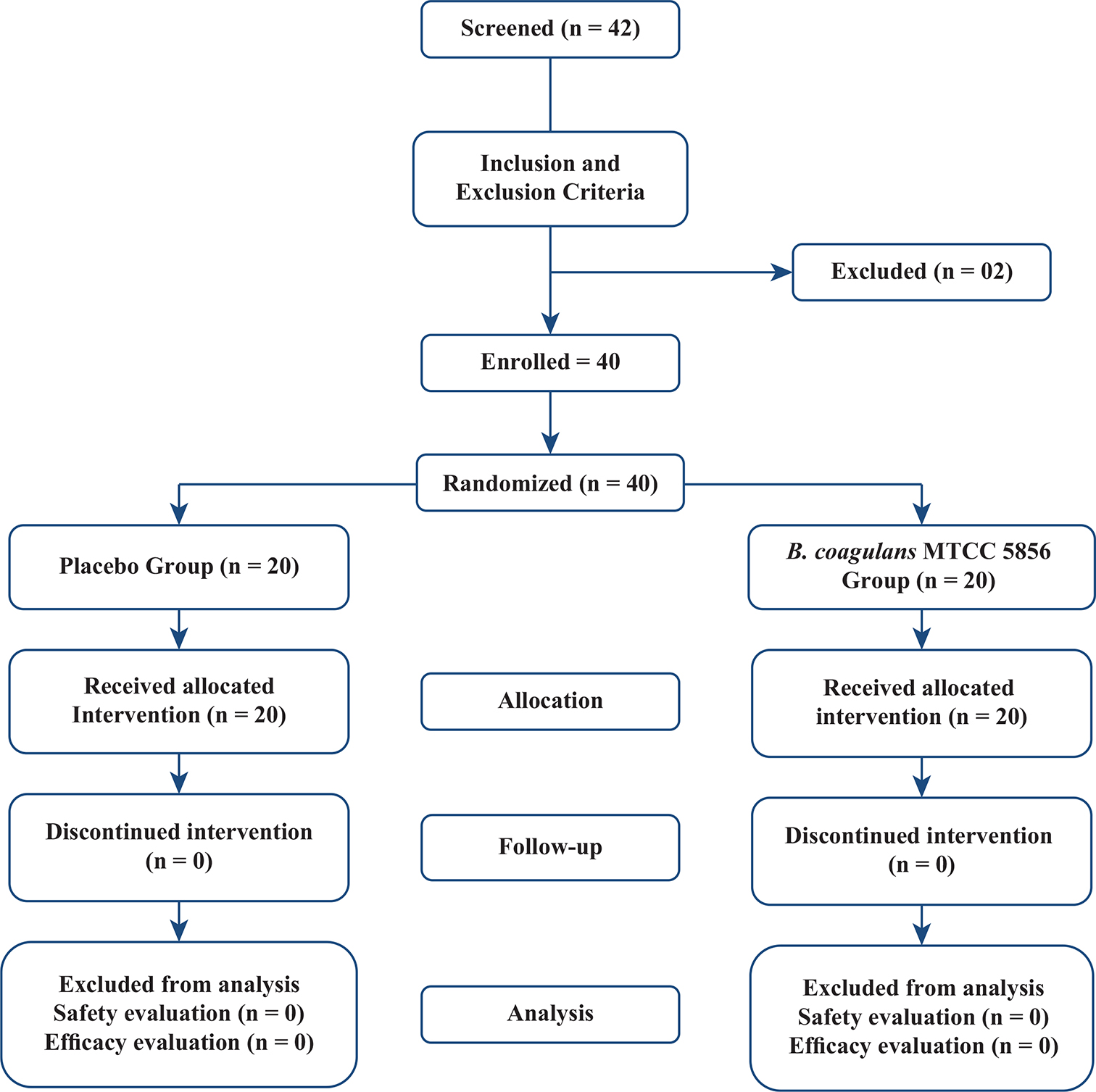 The investigational product in this study was B. coagulans MTCC 5856 tablets (600 mg) that contained 2 billion spores (333.33 mg), microcrystalline cellulose, starch, sodium starch glycolate and magnesium stearate. Placebo tablets had same ingredients except B. coagulans MTCC 5856. Placebo and investigational products were identical in terms of packaging, taste, colour and texture. B. coagulans MTCC 5856 spore count in the tablet was determined by following pour plate method as described previously (21).