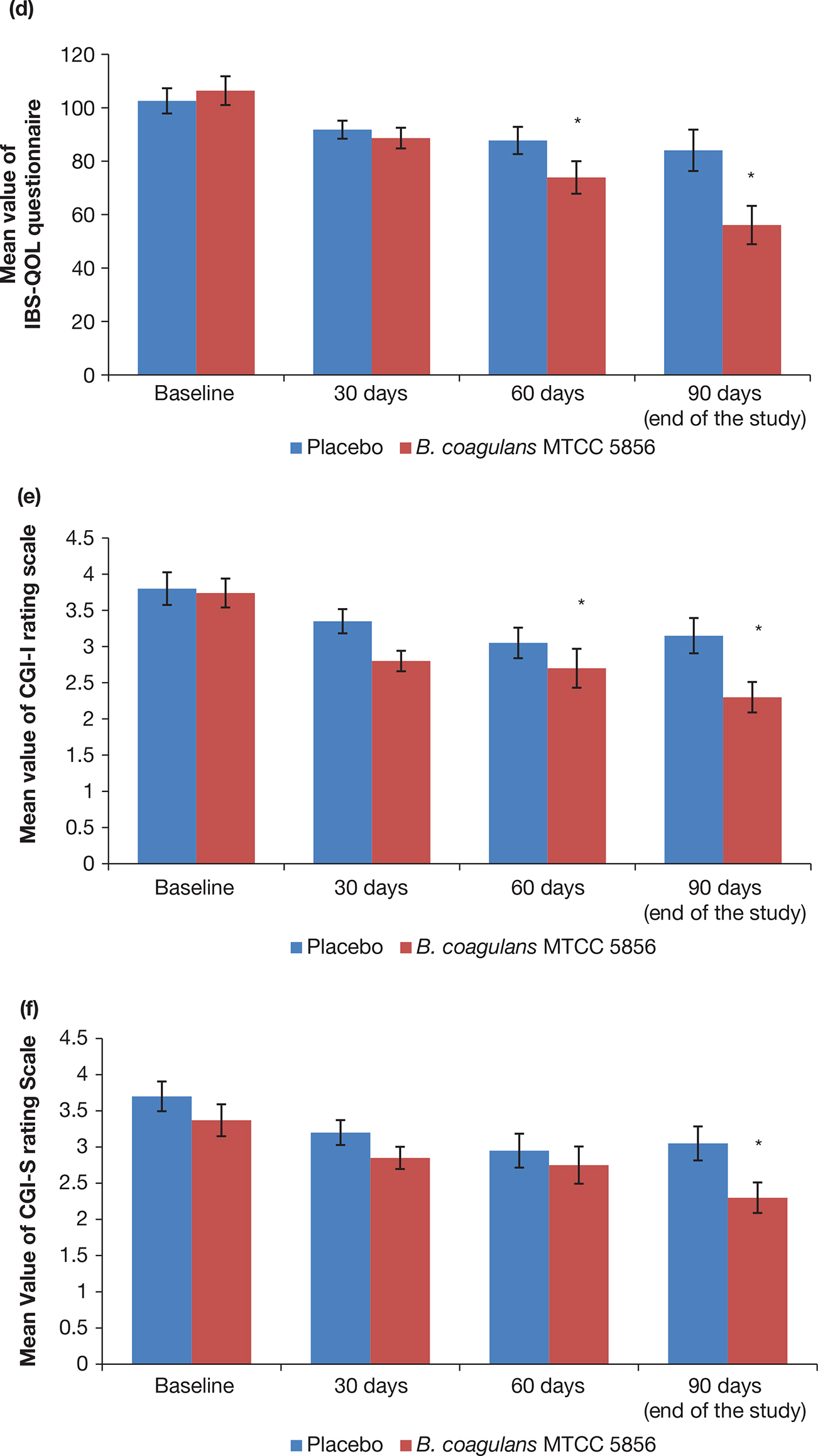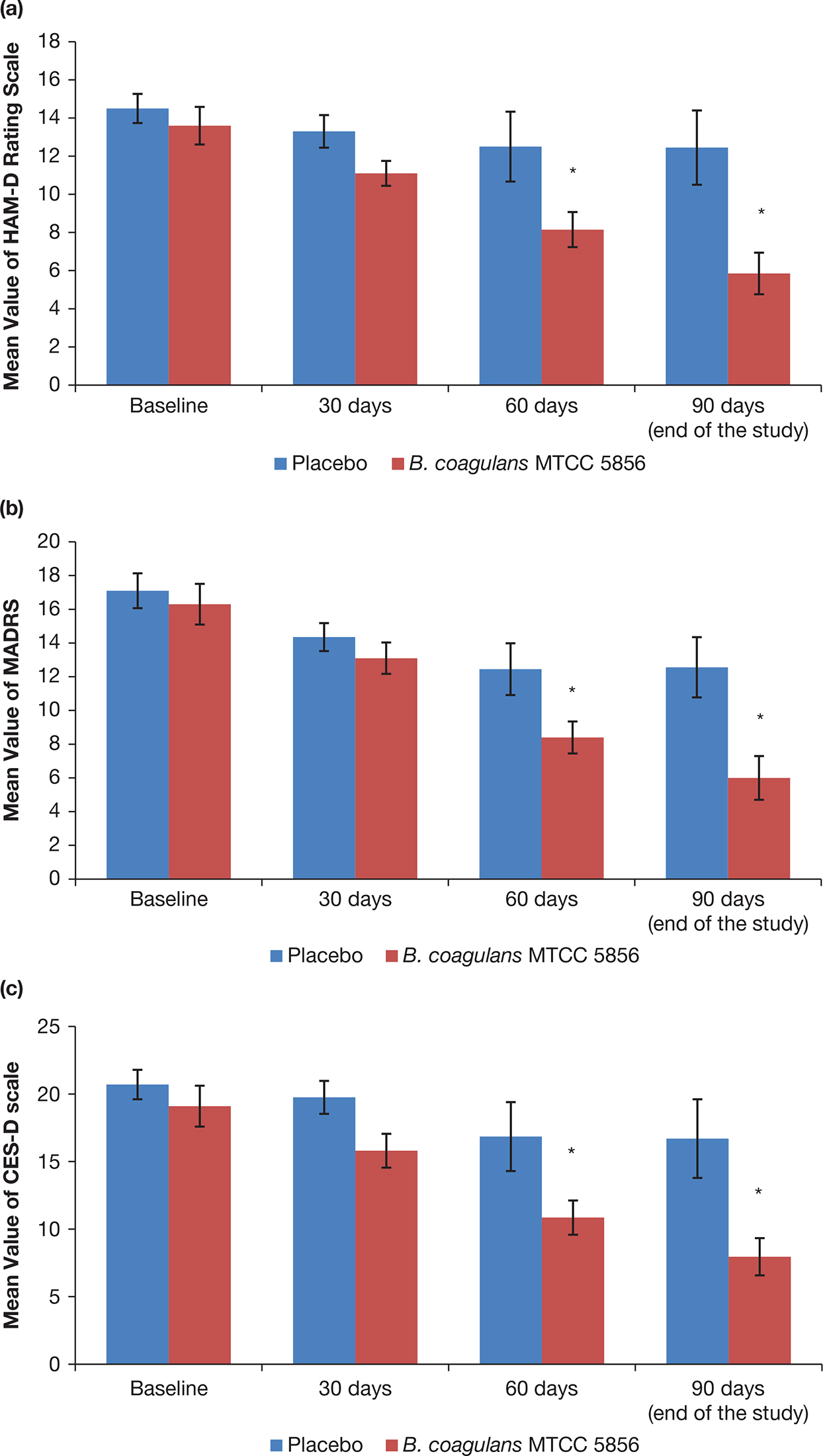 Method: Patients (n = 40) diagnosed for MDD with IBS were randomized (1:1) to receive placebo or B. coagulans MTCC 5856 at a daily dose of 2 × 109 cfu (2 billion spores) and were maintained to the end of double-blind treatment (90 days). Changes from baseline in clinical symptoms of MDD and IBS were evaluated through questionnaires.