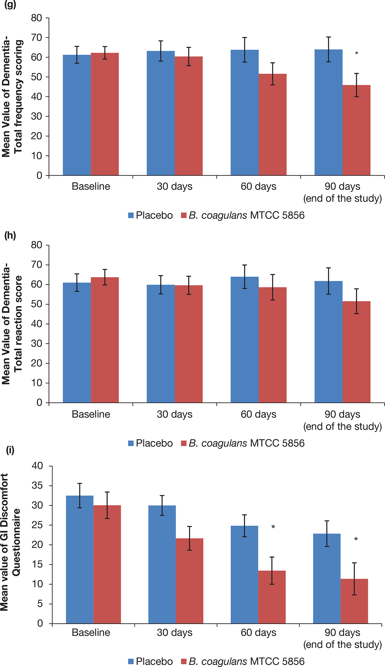 Statistical analysis using Analysis of Co-Variance (ANCOVA) showed that the primary efficacy parameters were found to be statistically significant (p < 0.01) between the B. coagulans MTCC 5856 and placebo groups (Table 3). Similarly, all secondary efficacy parameters were also found to be statistically significant between the B. coagulans MTCC 5856 and placebo groups except for ‘Dementia total reaction scoring’ (Table 3). Furthermore, comparative mean values of efficacy assessments between B. coagulans MTCC 5856 and placebo groups across various visits (baseline, day 30, day 60 and day 90) are as presented for primary efficacy parameters (Fig. 2a–d) and secondary efficacy parameters (Fig. 2e–j). Patients who were on B. coagulans MTCC 5856 had statistically significant difference for the efficacy parameters on day 60 and maintained till the end of the study when compared with placebo (Fig. 2).