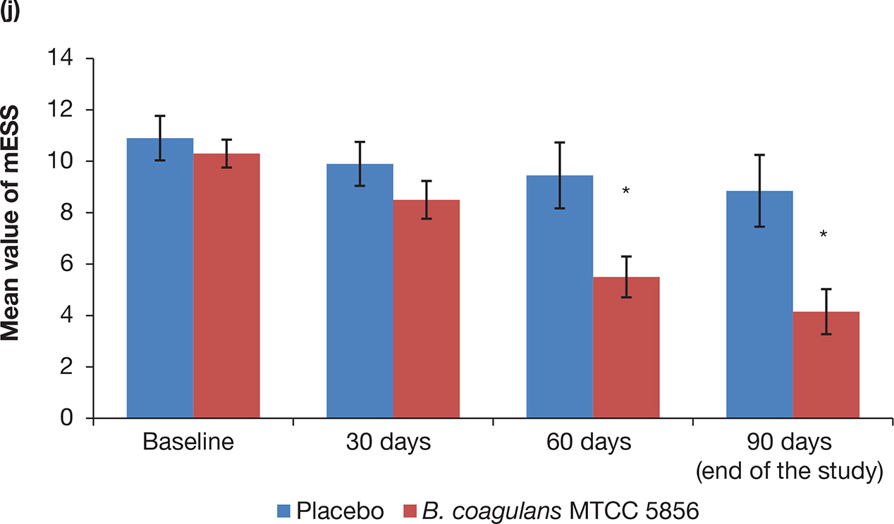 Results: Significant change (p = 0.01) in favour of the B. coagulans MTCC 5856 was observed for the primary efficacy measure Hamilton Rating Scale for Depression (HAM-D), Montgomery-Asberg Depression Rating Scale (MADRS), Center for Epidemiological Studies Depression Scale (CES-D) and Irritable bowel syndrome quality of life questionnaire (IBS-QOL). Secondary efficacy measures i.e. Clinical Global Impression-Improvement rating Scale (CGI-I), Clinical Global Impression Severity rating Scale (CGI-S), Gastrointestinal Discomfort Questionnaire (GI-DQ) and Modified Epworth Sleepiness Scale (mESS) also showed significant results (p = 0.01) in B. coagulans MTCC 5856 group compared to placebo group except dementia total reaction scoring. Serum myeloperoxidase, an inflammatory biomarker was also significantly reduced (p < 0.01) when compared with the baseline and end of the study. All the safety parameters remained well within the normal clinical range and had no clinically significant difference between the screening and at the end of the study.