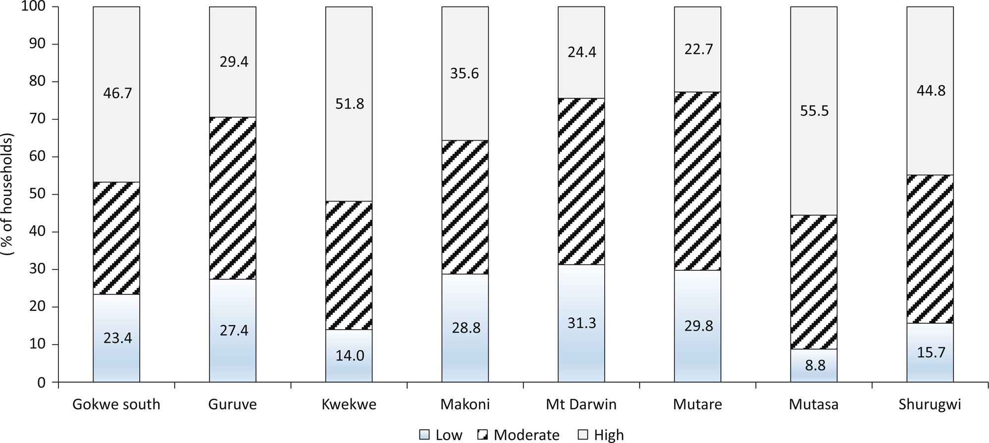 In this section, we categorized household into three levels to understand the proportions of household dietary diversity. Since there are no universal cut-offs for categorizing households according to their HDDS, the sample distribution was divided into HDDS tertiles which were characterized as low (0–5), moderate (6–7), and high (8–12) dietary diversity (23, 33). Figure 1 shows that Mt Darwin, Mutare and Makoni had a higher proportion of households with low dietary diversity relative to other districts. On the contrary, Mutasa, Kwekwe and Gokwe South had higher proportion of households with high dietary diversity. About 56 and 52% of the households were categorized as having high diversity in Mutasa and Kwekwe districts, respectively. Higher dietary diversity was confined to districts located in relatively high rainfall regions.