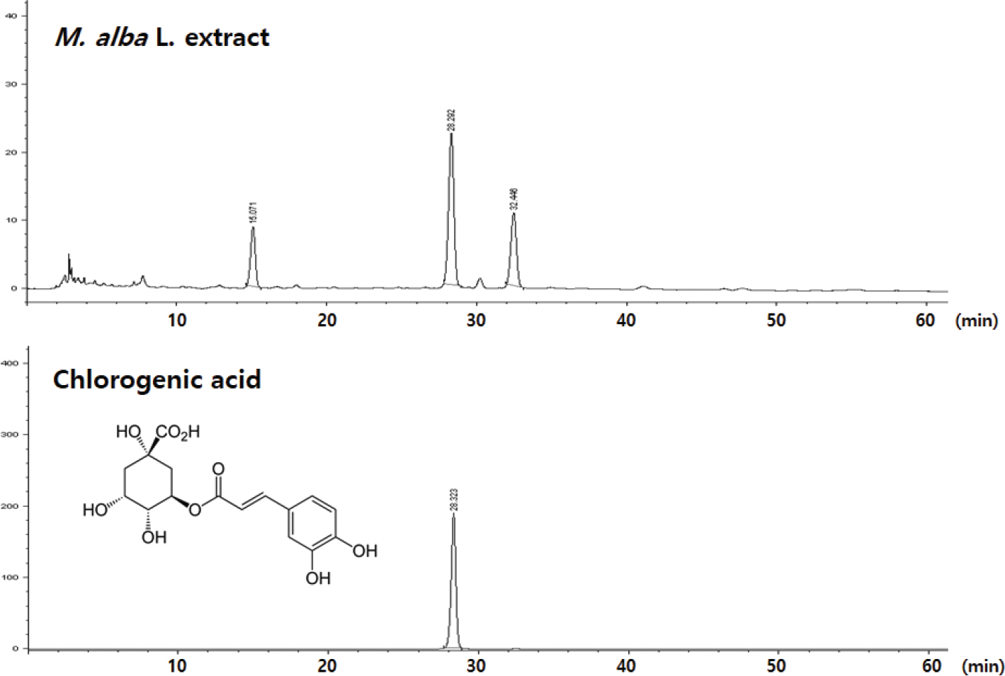 Dried fruits of M. alba were purchased from a local herbal market in Jeonbuk, Korea. The fruits were pulverized into powder and extracted twice with hot water (80°C) for 5 h. The solvent was removed under reduced pressure in a RV10 rotary evaporator (IKA, Staufen, Germany) to yield M. alba fruit hot water extract (42.8%, w/w). The extract was dried to a powder and kept in a closed container until use. To avoid variations in activity for different preparations, sufficient extract was obtained in one batch for use throughout the study. The content of the marker chlorogenic acid in M. alba L. was quantitated using high performance liquid chromatography. Results indicated that M. alba L. possessed 1.18 mg of chlorogenic acid per 1.0 g of extract (Fig. 1).