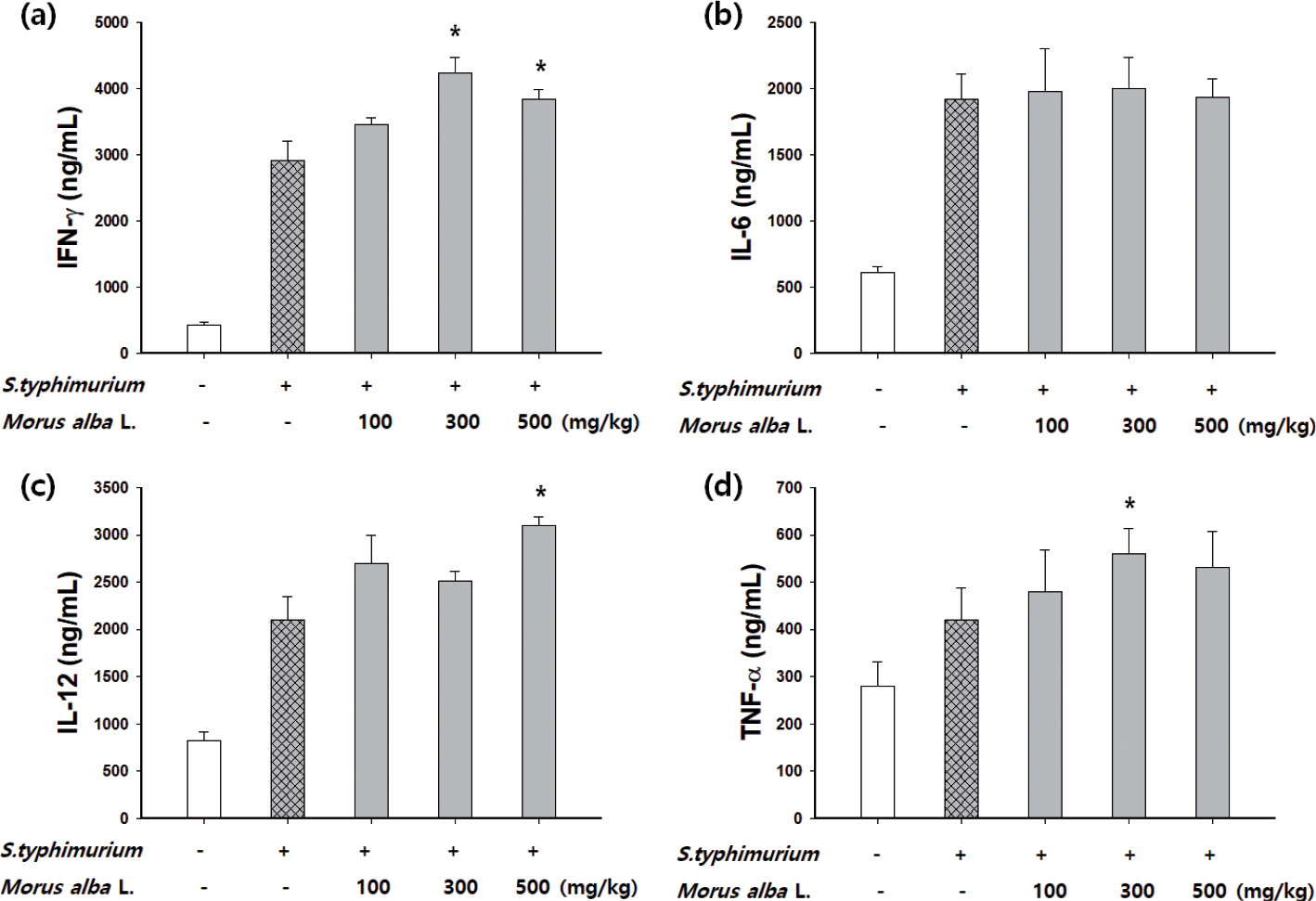Fig. 5. Effect of M. alba L. on the production of cytokines in mice challenged with pathogenic S. typhimurium. Morus alba L. (100, 300, or 500 mg/kg) was orally administrated for 5 days to mice, which were then intraperitoneally injected with a sublethal dose of a bacterial suspension (105 CFU/mouse) to induce peritonitis. At the end of the experiment, the mice were subjected to ether anesthesia. Serum was collected from the blood of infected mice pre-administered with M. alba L. to evaluate the serum levels of (a) IFN-γ, (b) IL-6, (c) IL-12, and (d) TNF-α. The data are the means ± SD, *p < 0.05 compared with the S. typhimurium group.