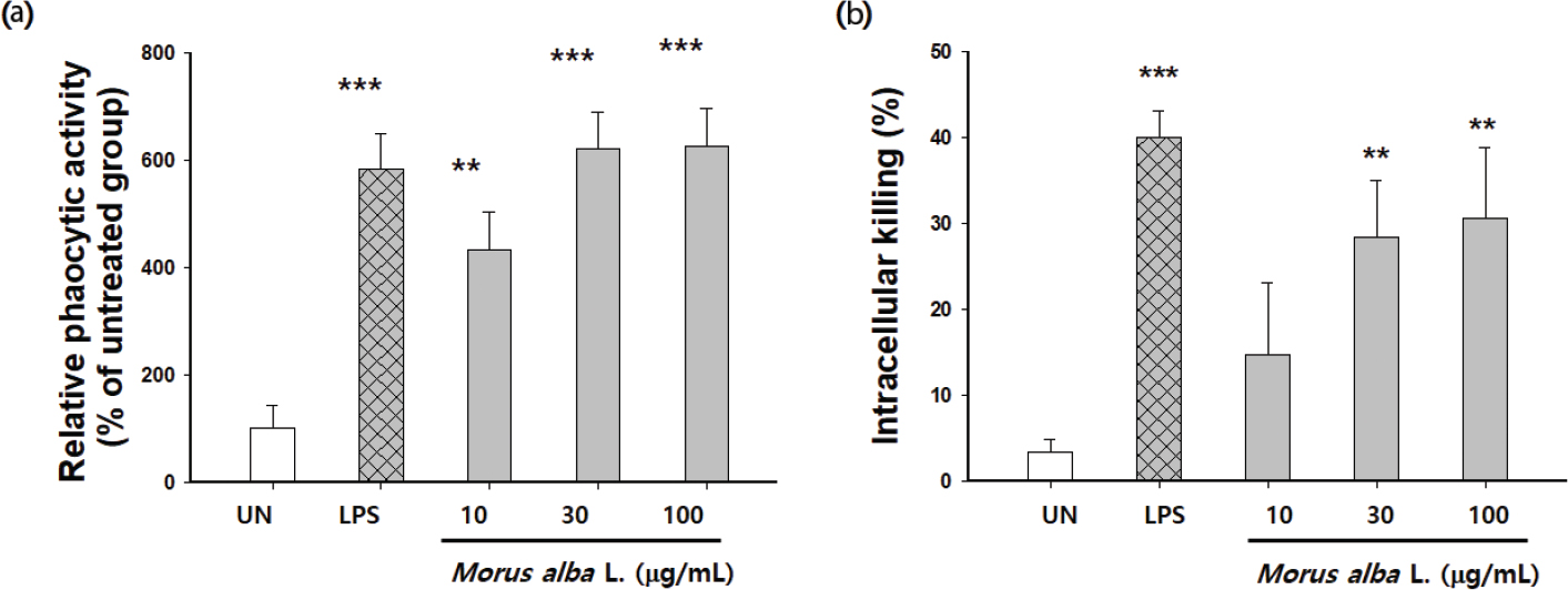 Fig. 6. Effects of M. alba L. on phagocytic activity and intracellular killing. Peritoneal macrophages derived from BALB/c mice or RAW 264.7 cells were treated with 10, 30, or 100 μg/mL of M. alba L. for 24 h, or with LPS (1 μg/mL) as a positive control. (a) After the addition of FITC-labeled E. coli, the cells were incubated for 2 h. The supernatants containing unphagocytosed bacteria were removed and then lysed with Triton X-100 containing lysis buffer. Fluorescence intensities of the lysed cells were measured by using a fluorescence microplate reader. (b) After the addition of S. typhimurium, the cells were incubated for 2 h. Unphagocytosed bacteria were removed and the cells were lysed with 1% saponin. The number of intracellular bacteria (CFU) was determined by serial dilution and plating on plate count agar (PCA). The values are the mean ± S.D. **p < 0.01, ***p < 0.001 compared with the untreated group.