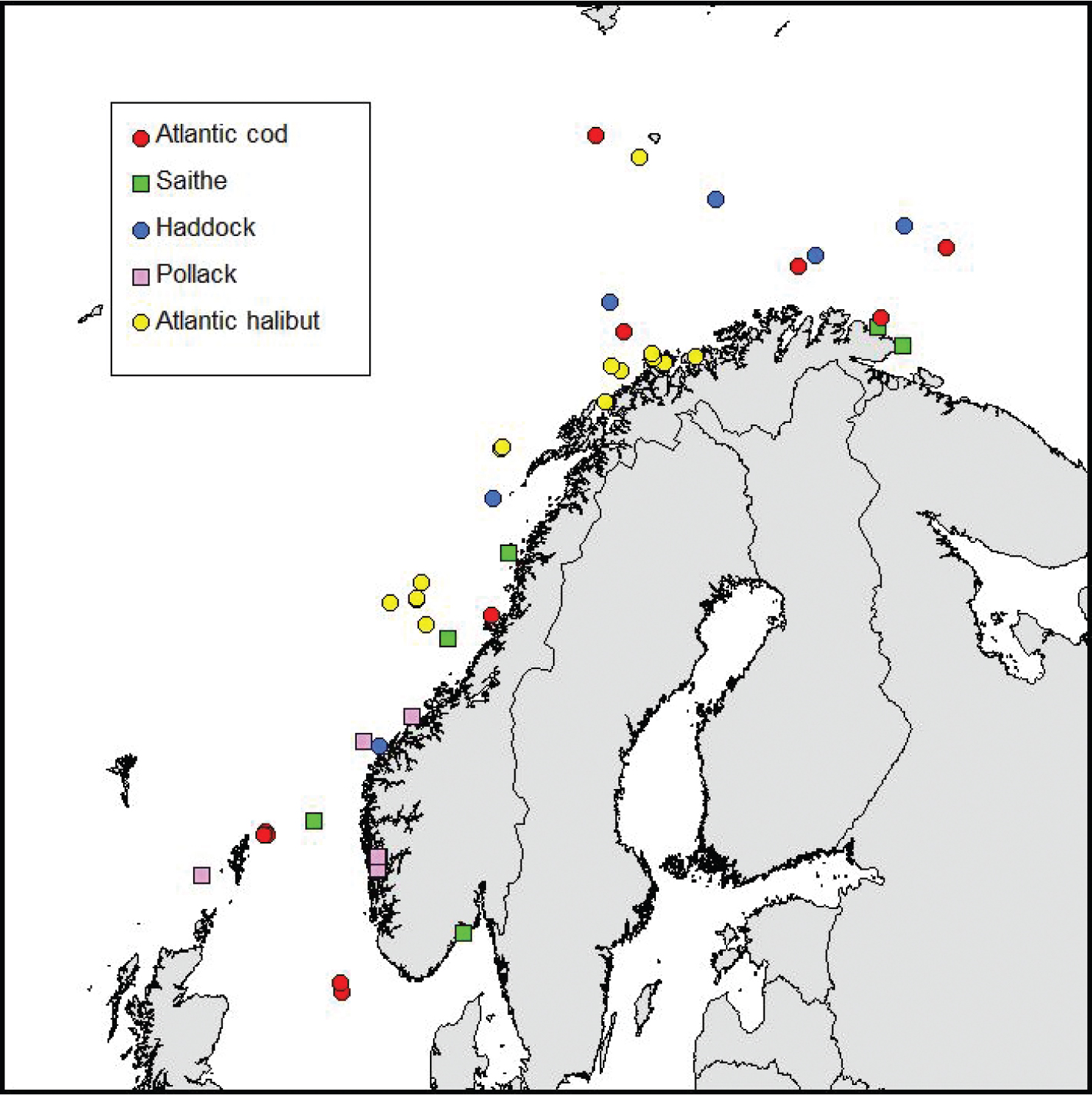 Five different species of wild fish were included in this study – Atlantic cod (Gadus morhua), saithe (Pollachius virens), haddock (Melanogrammus aeglefinus), pollack (Pollachius pollachius) and Atlantic halibut (Hippoglossus hippoglossus). Figure 1 illustrates sampling positions. Table 1 lists information regarding sampling period, number of positions and number of fish collected within the three major different sea areas – the Barents Sea, the Norwegian Sea and the North Sea.