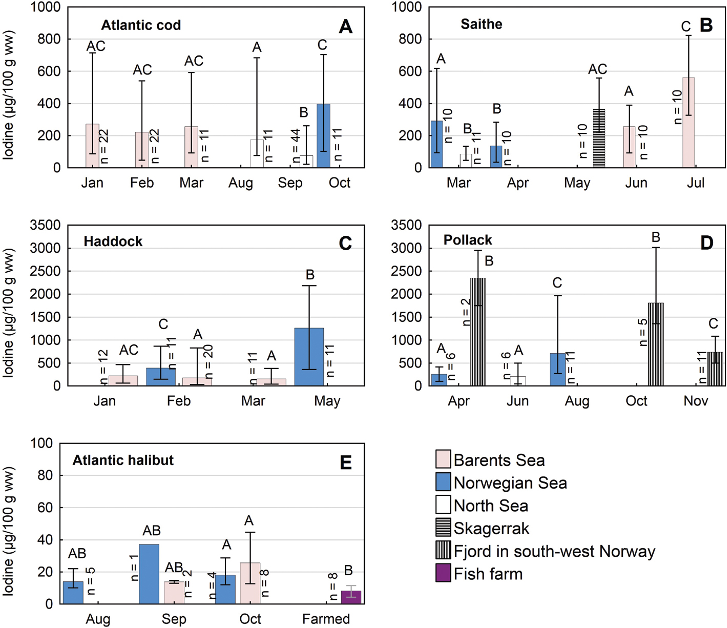 Fig. 2. Concentrations of iodine (μg/100 g ww) in A) Atlantic cod (Gadus morhua), B) saithe, (Pollachius virens), C) haddock (Melanogrammus aeglefinus), D) pollack (Pollachius pollachius) and E) Atlantic halibut (Hippoglossus hippoglossus) sampled during different months in different areas. Mean, minimum and maximum values are given. Significant differences between groups on log10-transformed concentrations (one-way ANOVA followed by Tukey HSD) are indicated with different letters. Notice different scaling on the y-axis for the different species.