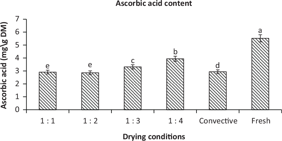 Fig. 2. Ascorbic acid content of fresh and dried sample slices under different PRs 1:1, 1:2, 1:3, 1:4 and convective drying. Different letters (a, b, c, d) indicate significant differences (p ≤ 0.05) among the samples under different drying conditions. Identical letters indicate no significant difference.