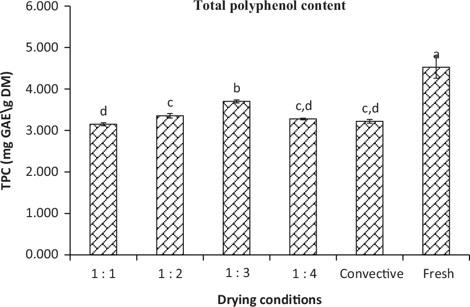 Fig. 3. Total polyphenol content of fresh and dried sample slices under different PRs 1:1, 1:2, 1:3, 1:4, and convective drying. Different letters (a, b, c, d) indicate significant differences (p ≤ 0.05) among the samples under different drying conditions. Identical letters indicate no significant difference.
