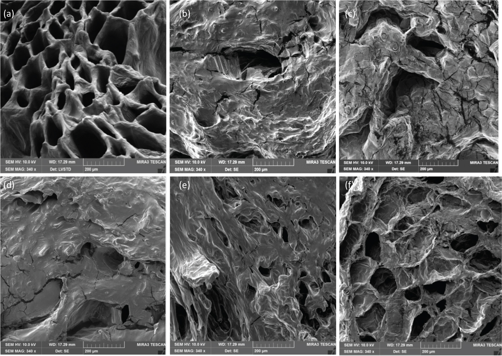 Fig. 4. Microstructure of sample slice in fresh condition and dried state under different drying conditions. (a) Fresh samples, (b) PR 1:1 sample, (c) PR 1:2 sample, (d) convective sample, (e) PR 1:3 sample, and (f) PR 1:4 sample.