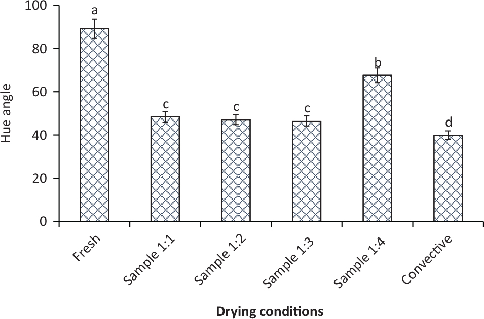 In addition to colour changes, the hue angle of the dried samples in convective drying, as well as IMCD, was considerably different from the fresh sample as shown in Fig. 5. In light of this finding, it is clear that the hue angle (values from 40 to 68) implies high colour changes at IMCD PR 1:1, 1:2 and 1:3, but there was an insignificant difference among these IMCD conditions (p > 0.05). However, the colour of the product under these conditions was still better than in the case of convective drying (p ≤ 0.05). Hue angle of the sample dried in IMCD with the lowest PR (PR 1:4) resulted in the closest hue angle to the fresh sample (p ≤ 0.05). Reducing the PR further may result in less degradation of colour (closer to the hue angle of the fresh sample). However, it will increase the total drying time, which might also negatively affect colour as extended time exposure to drying environment facilitated browning reaction as in the case of convective drying. Therefore, PR 1:4 can be considered the best operating condition for the best colour, AAC retention and achievement of shorter drying time.