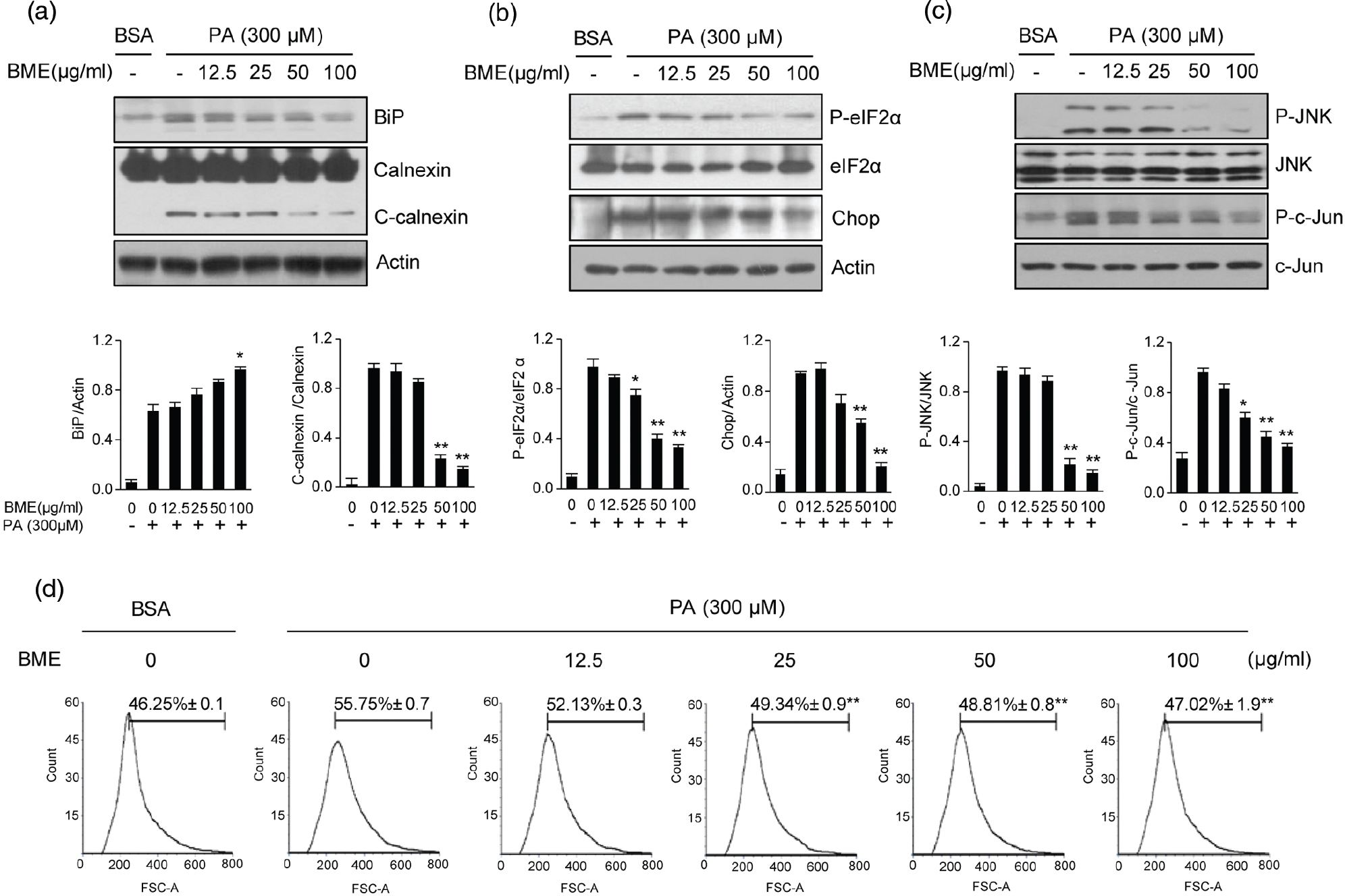 Fig. 2. Reduction of ER stress–related markers in BME-treated HepG2 cells. HepG2 cells were treated with different concentrations of BME and 300 μM PA for 12 h. DMSO was used as a vehicle. ER stress was analyzed by measuring levels of BiP, calnexin (a), P-eIF2α, CHOP (b), P-JNK and P-c-Jun (c). Data are expressed as mean ± SD of three independent experiments. *p < 0.05, **p < 0.01 versus PA-treated group. (d) After treatment with BME and PA, cells were stained with DCFDA for 10 min. After washing twice with PBS, fluorescence intensity of DCFDA was determined by flow cytometry. Gated percentages are shown graphically. **p < 0.01 versus PA-treated group.
