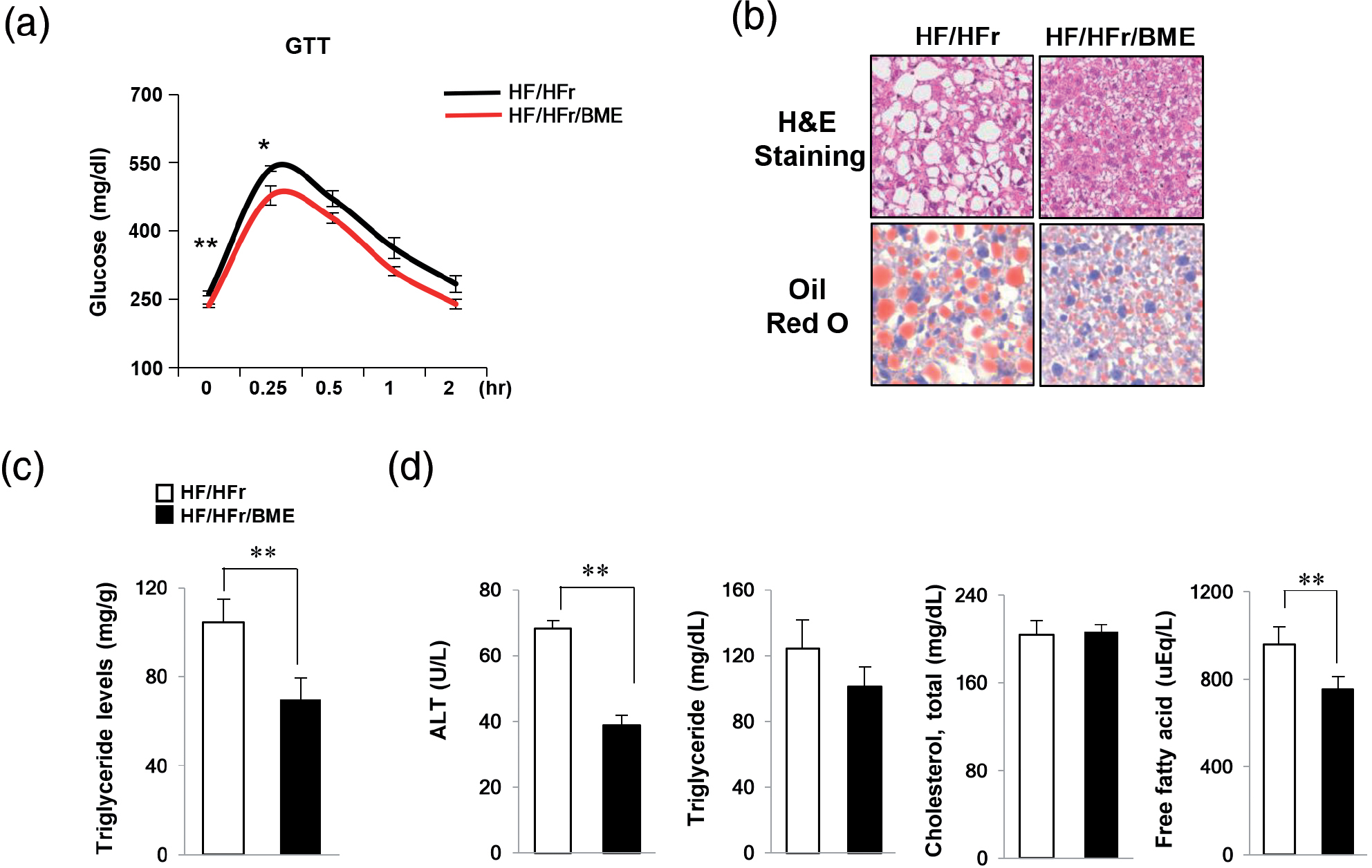 Fig. 3. Protection effects of BME on fatty liver induced by HF/HFrD. (a) HF (containing 60% fat)/HFr (containing 30% fructose) water was administered to C57BL/6J mice for 7 weeks. Subsequently, the mice were randomly divided into two groups (n = 6 mice/group). Each group was orally administered either DMSO or BME (100 mg/kg) on every other day for 5 weeks under the HF/HFr diet. (a) After 5 weeks, GTT was then carried out by measuring glucose levels at 0, 0.25, 0.5, 1, and 2 h after glucose injection (1 g/kg). Livers were isolated from HF/HFr and HF-/HFr-/BME-fed mice. Data are presented as mean ± SEM (n = 6 per group). *p < 0.05, **p < 0.01 versus HF/HFr group. (b) Liver sections stained with hematoxylin & eosin and Oil Red O. (c) Liver TG was extracted using the Folch extraction method and TG level was then measured with a TG assay kit. (d) Levels of plasma ALT, TG, cholesterol, and FFA were measured using an autochemical analyzer. Data are presented as mean ± SEM (n = 6 per group). **p < 0.01 versus HF/HFr group (c, d).
