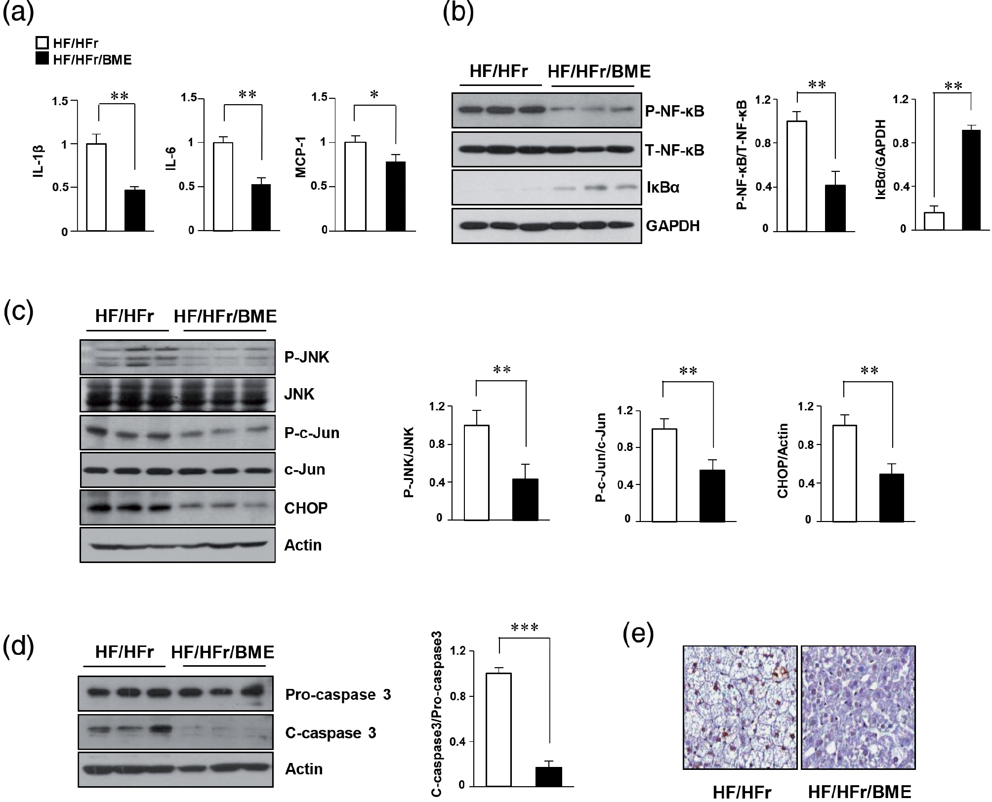 Fig. 4. Beneficial effects of BME on inflammation and ER stress–mediated apoptosis in HF-/HFr-fed mice. Livers were isolated from HF/HFr and HF-/HFr-/BME-fed mice. (a) Hepatic mRNA was isolated from mice livers, and levels of interleukin IL-1β, IL-6, and MCP-1 mRNAs were quantified by real-time quantitative PCR. *p < 0.05, **p < 0.01 versus HF/HFr group. (b) Proteins isolated from mice livers. NF-κB protein levels were determined by western blot analysis. **p < 0.01 versus HF/HFr group. (c, d) Expression levels of P-JNK, P-c-Jun, CHOP, and C-caspase-3 were detected by western blot analysis. *p < 0.05, **p < 0.01, ***p < 0.001 versus HF/HFr group. (e) TUNEL staining of liver tissue sections showing DNA fragmentation.