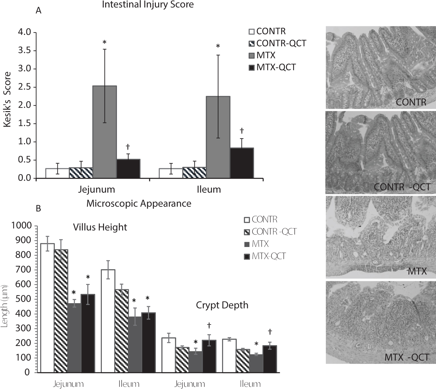 Fig. 2. Effects of MTX and QCT on intestinal injury score and microscopic appearance. The following parameters were investigated: (A) Degeneration of surface and crypt epithelium; (B) degeneration of villus structure, vacuolization in the surface epithelium; and (C) inflammatory cell infiltration, and bleeding and edema in the lamina propria. For each criterion, a score was given using a semiquantitative scale as follows: 0 = none, 1 = mild, 2 =moderate, 3 = severe, giving a maximum possible score of 9 for each segment. Values are mean ± SEM. CONTR, control; MTX, methotrexate; QCT, quercetin. *p < 0.05 MTX and MTX-QCT versus CONTR rats; †p < 0.05 MTX-QCT versus MTX.