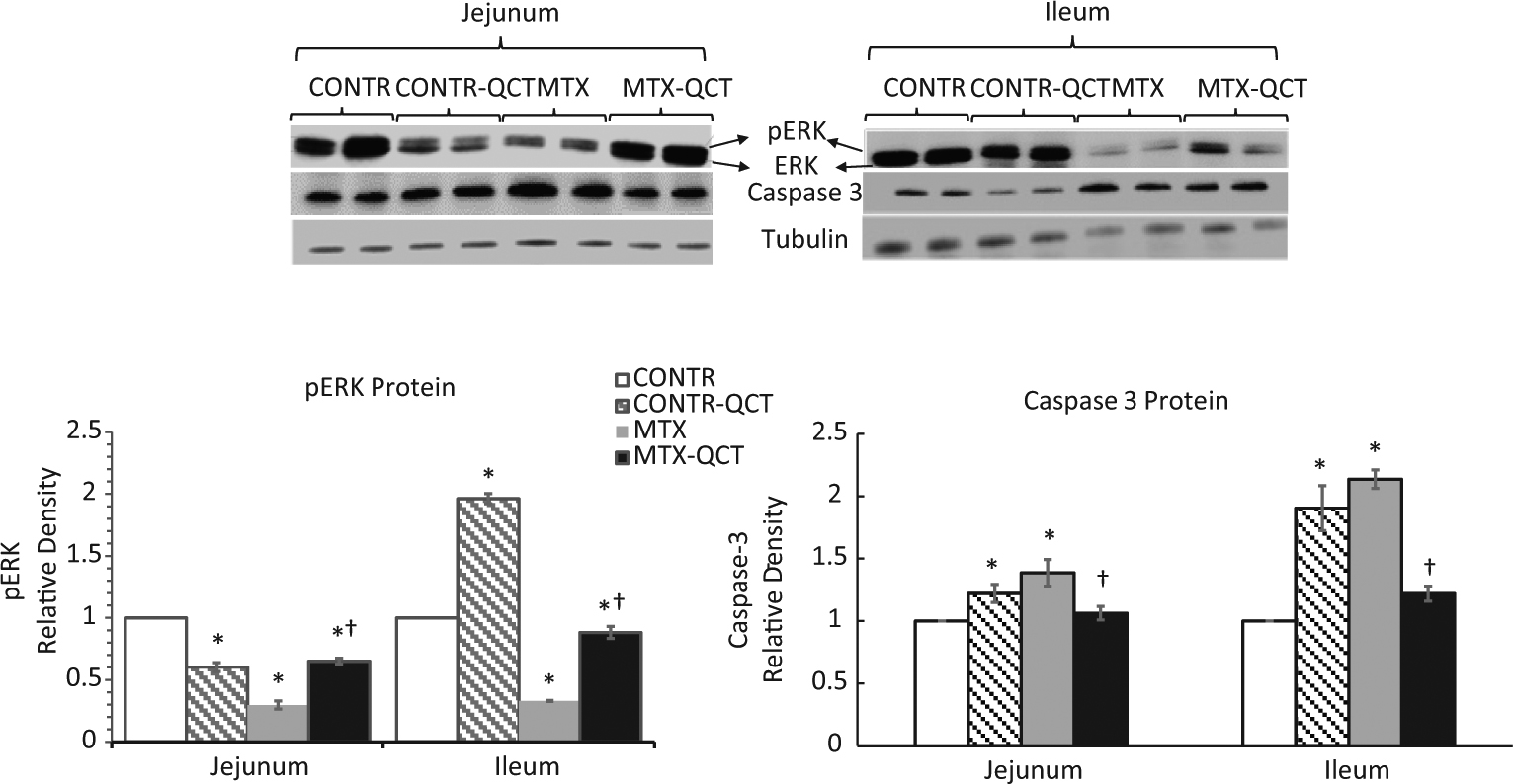 Fig. 4. Effects of MTX and oral QCT on proliferation (p-ERK) and apoptosis (caspase-3)-related proteins (Western blot). Results are calculated as the ratio to tubulin and are expressed as a percentage of control animals. CONTR, control; MTX, methotrexate; QCT, quercetin. *p < 0.05 MTX and MTX-QCT versus CONTR rats; †p < 0.05 MTX-QCT versus MTX.