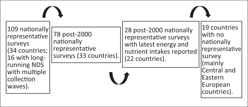 However, the surveys employed different methodologies, both between surveys and within long-running surveys with multiple collection waves, potentially making the task of comparing countries problematic. Despite this, we feel that there is still a need to use the available information to make inter-country comparisons where possible. Another limitation of the review was that we were unable to establish contact with nutrition experts or government officials who may be working in nutrition in some of the 19 countries where no surveys were found, which were mainly Central and Eastern European countries. Therefore, we cannot ascertain that these countries do not have any relevant dietary surveys. We also cannot assure that there are no other nationally representative surveys in countries where we obtained survey information from contacts. However, it is likely that these contacts would be aware of other surveys in their countries; in the distributed questionnaire, contacts were asked for details of all surveys in their country.