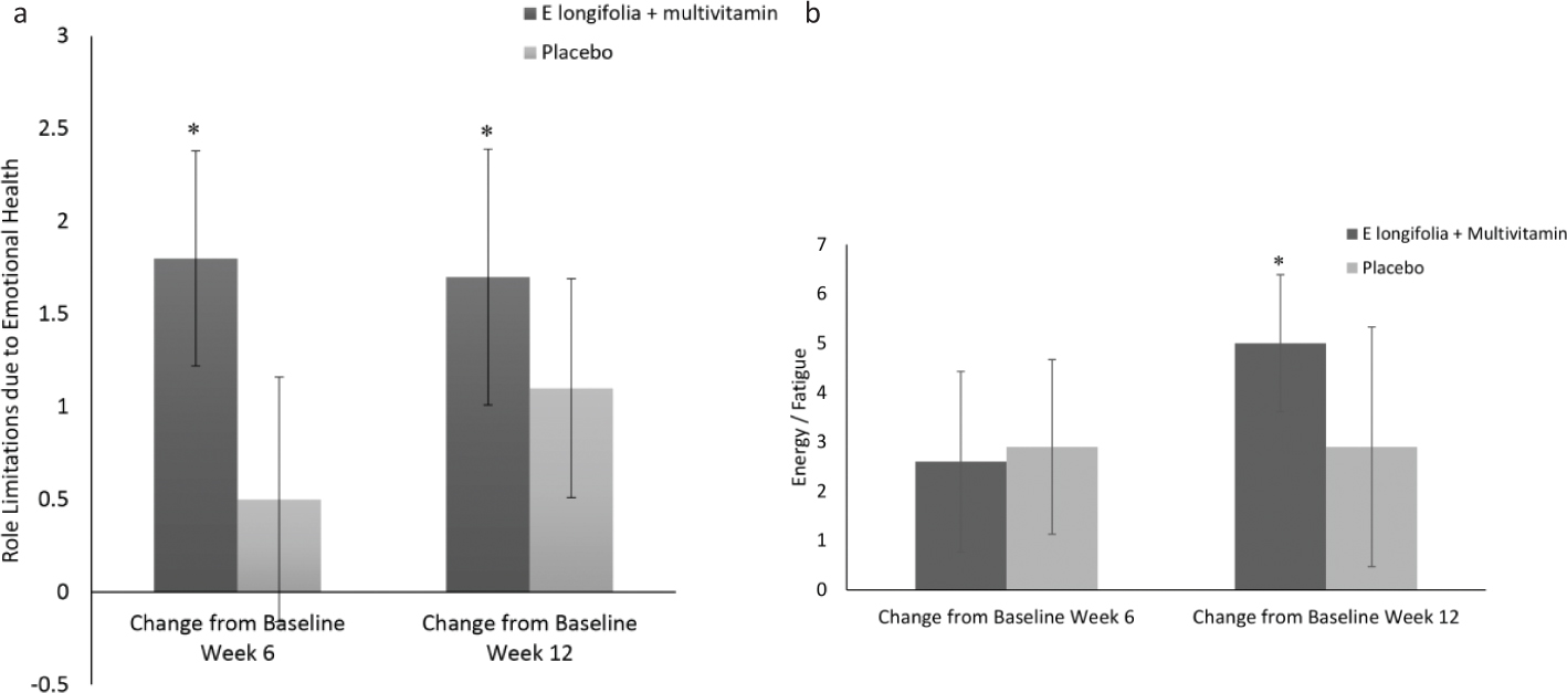 The primary and secondary outcomes measures were assessed by questionnaires at week 0 (Visit 0), week 6 (Visit 1) and 12 (Visit 2). The primary outcome measure for this study was the assessment of the efficacy of EL+MV versus placebo on mood and QoL. Mood state was assessed using the POMS questionnaire, which consisted of the following: total mood disturbance and its subscales, tension, depression, anger, fatigue, confusion and vigour. The POMS rated emotional and physical aspects of mood as ranging from ‘not at all (1 point)’ to ‘extremely (5 points)’. A lower score, except for vigour, indicates better mood.