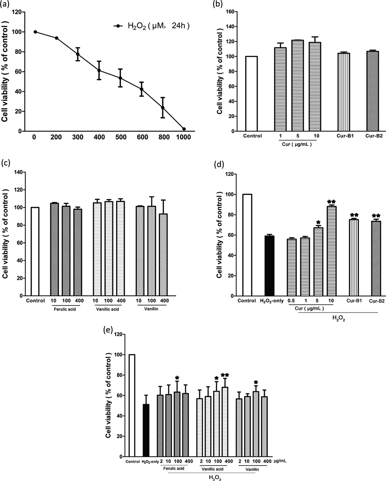 Fig. 1. Cell viability detected by MTT assay. PC12 cells were treated with curcumin (0.5–10 μg/mL), boiled curcumin mixture Cur-B1 (360 μg/mL), boiled curcumin mixture Cur-B2 (360 μg/mL), ferulic acid (2–400 μg/mL), vanillic acid (2–400 μg/mL) and vanillin (2–400 μg/mL) for 0.5 h prior to exposure to 500 μM H2O2. The cytotoxic doses of H2O2 (a), curcumin, Cur-B1, Cur-B2 (b), and the selected degradation products of curcumin (c) were determined. The protective effect of curcumin, Cur-B1, and Cur-B2 (d) and the selected degradation products of curcumin (e) on H2O2 induced cytotoxicity in PC12 cells. Data were displayed as mean ± SD value from three separate experiments. Bars with different features manifested statistical difference at p < 0.05. *p < 0.05, different from H2O2-only group; **p < 0.01, significantly different from H2O2-only group.