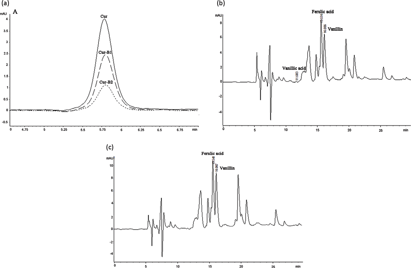 Fig. 2. Chromatogram of standard curcumin, boiled curcumin mixture Cur-B1, and boiled curcumin mixture Cur-B2. The selected degradation products of curcumin (ferulic acid, vanillic acid, and vanillin) were identified by HPLC/UV. Overlapping picture of 1 μg/mL standard curcumin, 360 μg/mL Cur-B1, and 360 μg/mL Cur-B2 at 430 nm (a); 360 μg/mL Cur-B1 at 280 nm (b); 360 μg/mL Cur-B2 at 280 nm (c).