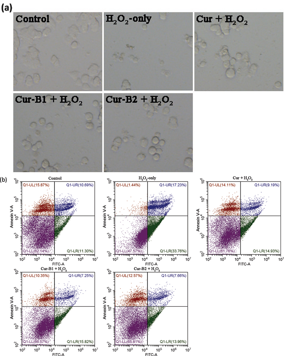 Fig. 3. Inhibitory effects of curcumin, boiled curcumin mixture Cur-B1, and boiled curcumin mixture Cur-B2 on H2O2-induced PC12 cell apoptosis. PC12 cells were treated with 10 μg/mL curcumin, 360 μg/mL Cur-B1, and 360 μg/mL Cur-B2 for 0.5 h prior to exposure to 500 μM H2O2. Then, PC12 cells were observed by a phase contrast microscope (×200) (a). PC12 cells were stained with a double dye of annexin V-FITC/PI after treatment with curcumin or boiled curcumin mixture and the apoptosis rates of each group were detected by flow cytometer (b).