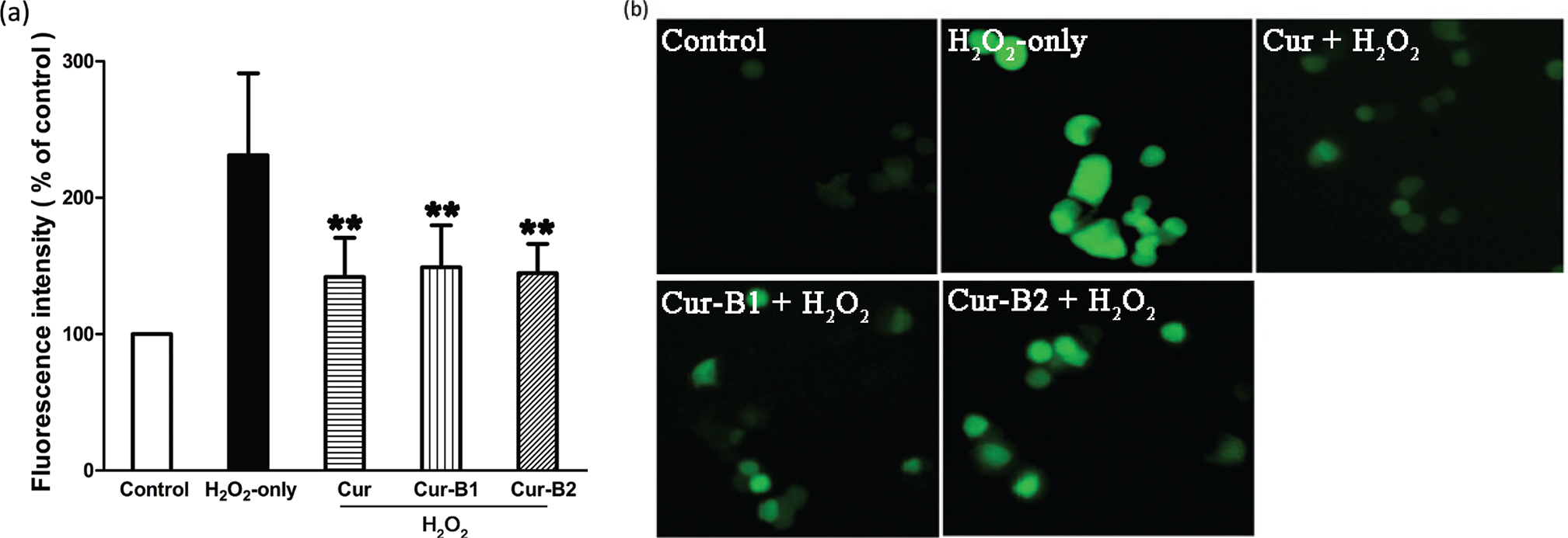 Fig. 4. Inhibitory effects of curcumin, boiled curcumin mixture Cur-B1, and boiled curcumin mixture Cur-B2 on H2O2-induced intracellular ROS enhancement in PC12 cells. PC12 cells were treated with 10 μg/mL curcumin, 360 μg/mL Cur-B1, and 360 μg/mL Cur-B2 for 0.5 h prior to exposure to 500 μM H2O2. DCFH-DA fluorescence intensity analysis was shown as mean ± SD values from three separate experiments through a fluorescence microplate reader (a). Bars with different features manifested statistical difference at p < 0.05. *p < 0.05, different from the H2O2-only group; **p < 0.01, significantly different from the H2O2-only group. Representative images of DCFH-DA staining in PC12 cells were observed by fluorescent microscopy (b).