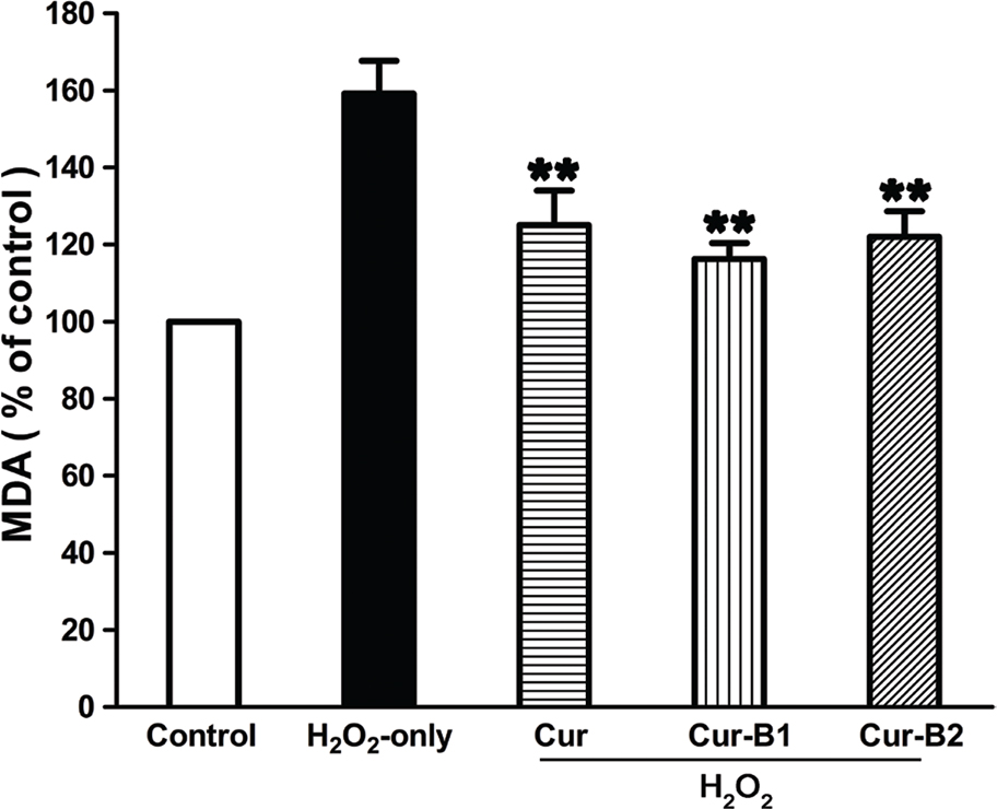 Fig. 5. Suppressing effects of curcumin, boiled curcumin mixture Cur-B1, and boiled curcumin mixture Cur-B2 on H2O2-induced enhancement of MDA level in PC12 cells. PC12 cells were treated with 10 μg/mL curcumin, 360 μg/mL Cur-B1, and 360 μg/mL Cur-B2 for 0.5 h prior to exposure to 500 μM H2O2. Data were manifested as mean ± SD values from three independent experiments. Bars with different characteristics show statistical difference at p < 0.05. *p < 0.05, different from H2O2-only group; **p < 0.01, significantly different from H2O2-only group.