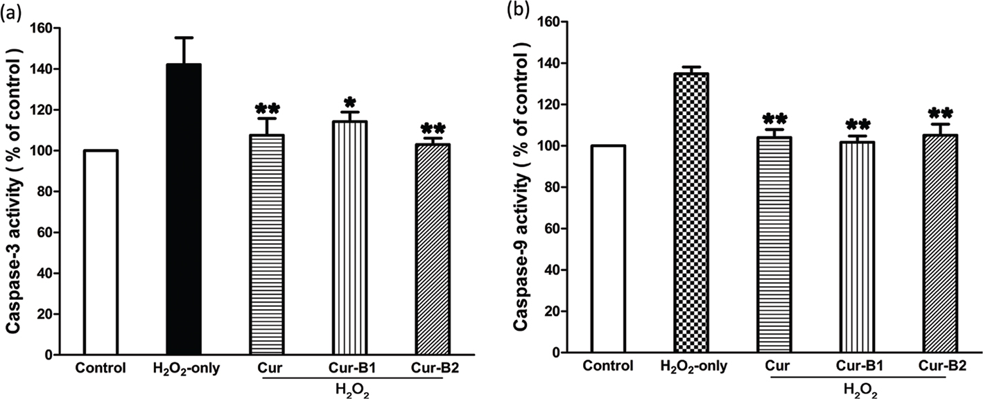 Fig. 6. Suppressing effects of curcumin, boiled curcumin mixture Cur-B1 and boiled curcumin mixture Cur-B2 on H2O2-induced caspase-3 (a) and caspase-9 (b) activation in PC12 cells.
