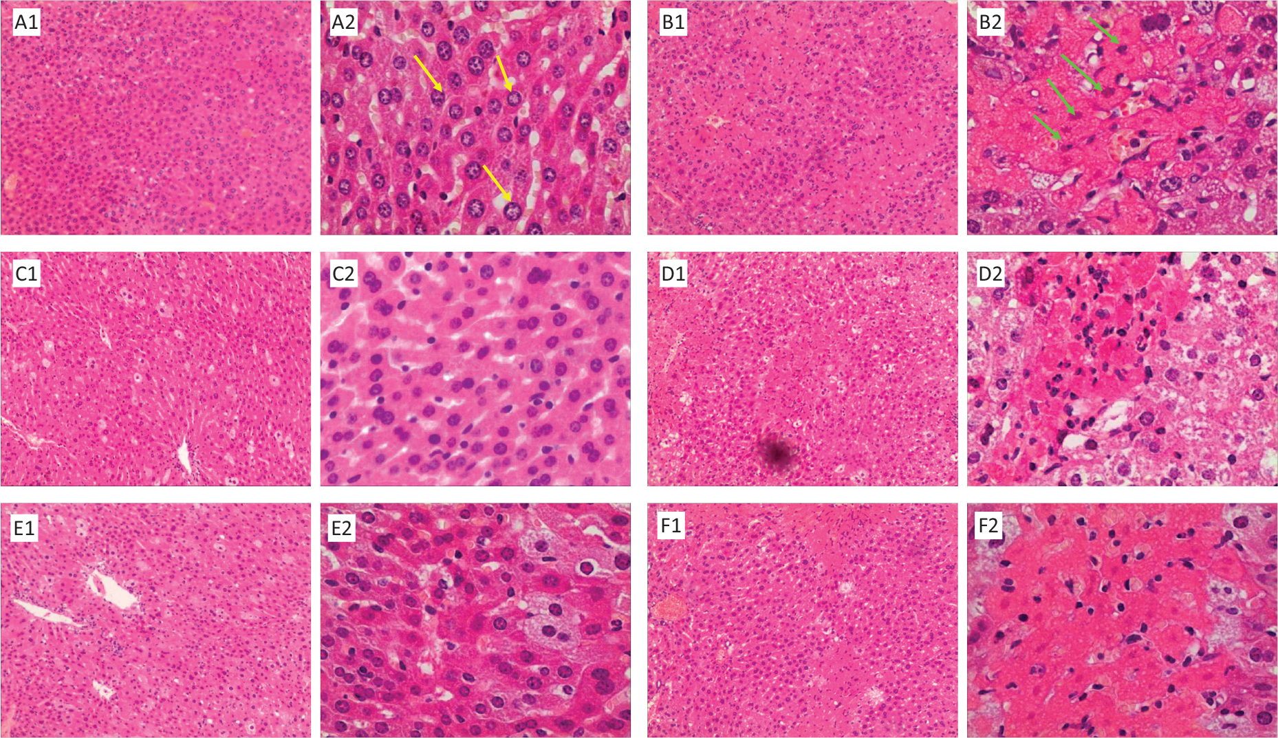 Fig. 1. Images of histopathological examination (Hematoxylin and Eosin;1, 100×; 2, 400×). (A) normal control group; (B) treated with CCl4; (C) pretreated with bifendate (100 mg/kg bw), (D) pretreated with FPLR (50 mg/kg bw), (E) pretreated with FPLR (100 mg/kg bw) and (F) pretreated with FPLR (200 mg/kg bw) before CCl4 treatment. The yellow arrows indicate normal cellular architecture with a clear hepatic cell nucleus. The green arrows indicate hepatic cell necrosis.