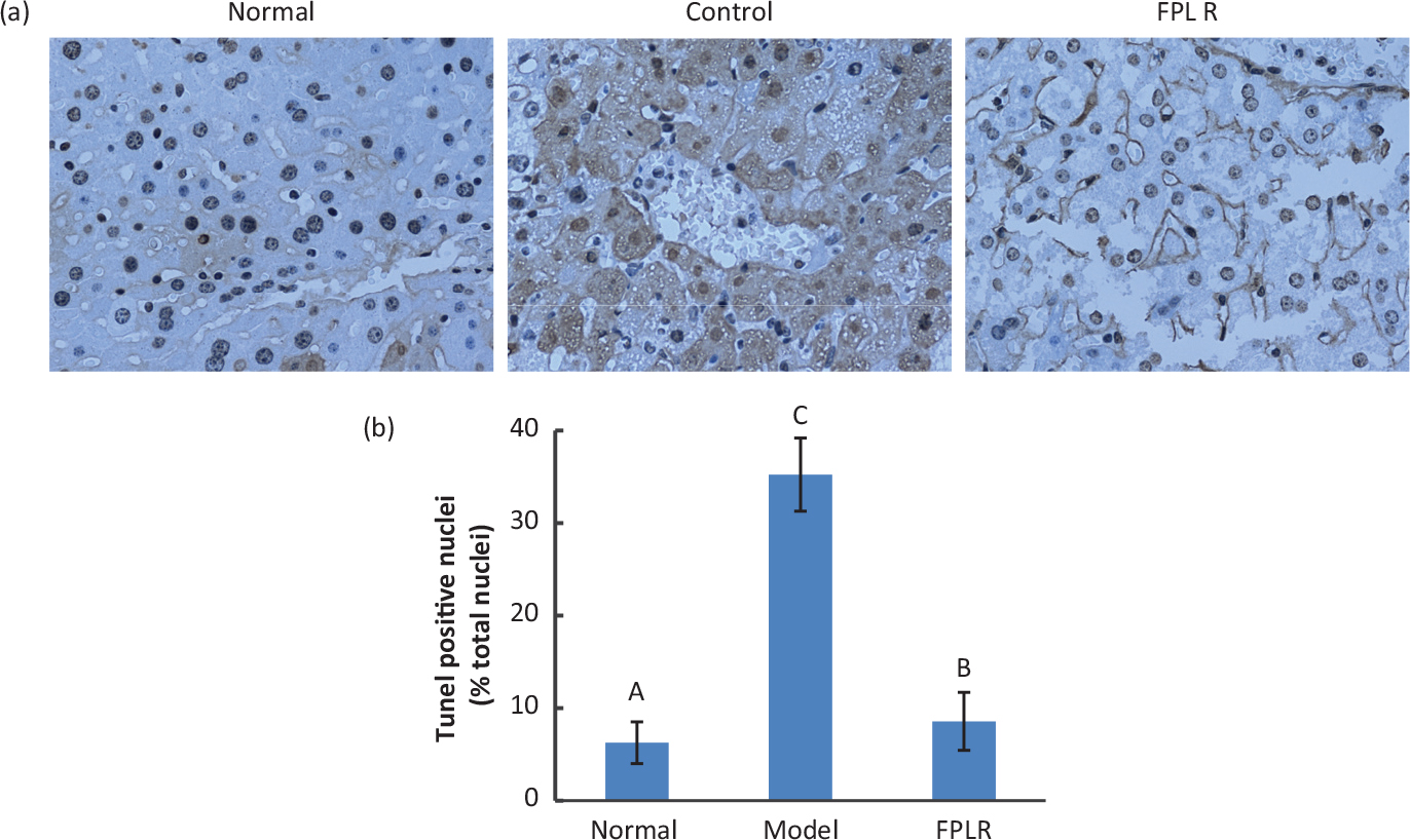 Fig. 2. (a) TUNEL stained images (40×) in normal control, model and FPLR (100 mg/kg bw) + CCl4 groups. (b) Statistic analysis of TUNEL-stained images. Values expressed as mean ± SD in each group (n = 10). The different capital letters indicate significant differences among the different groups at p < 0.01.
