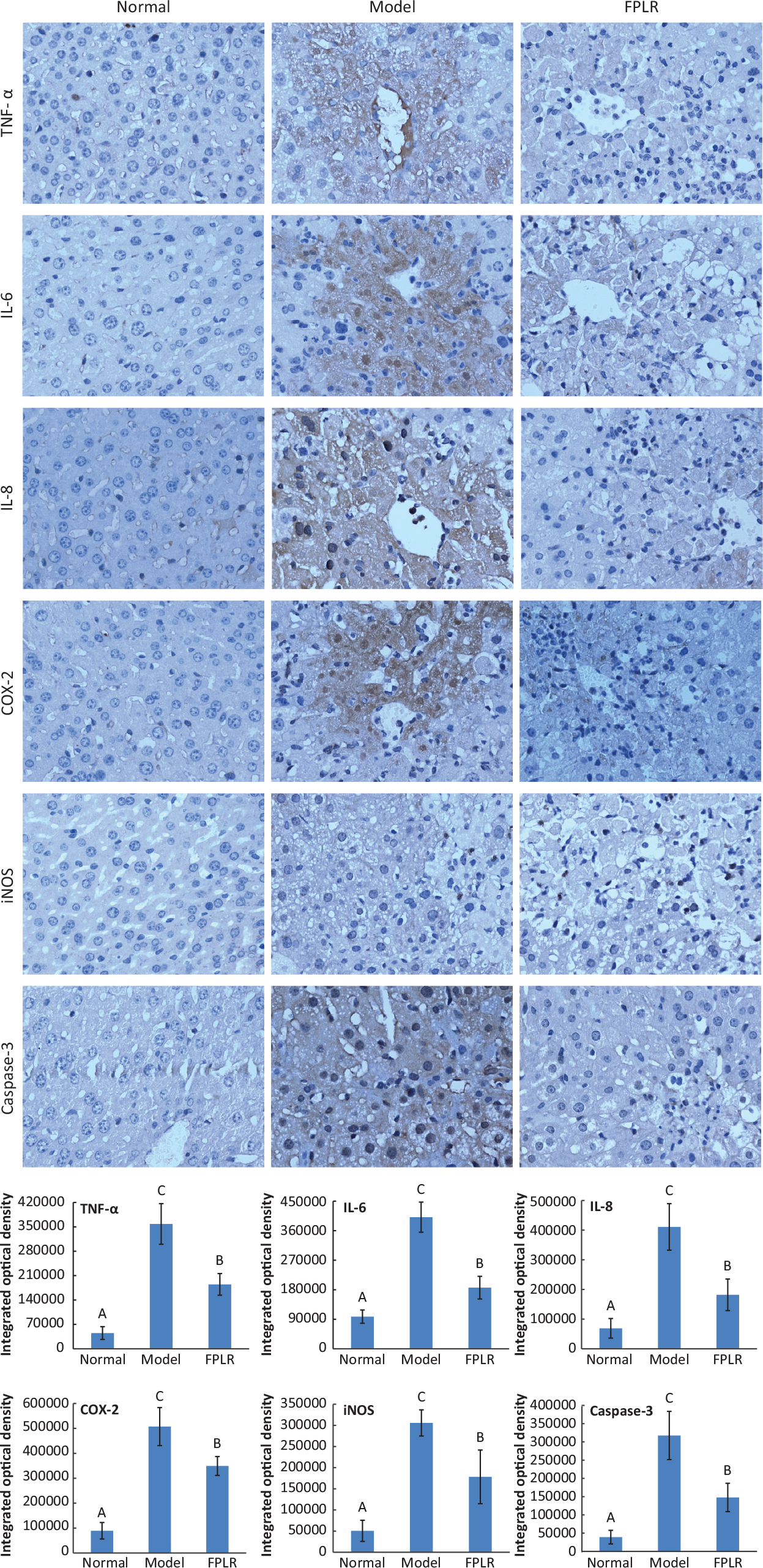 Fig. 3. Effects of FPLR (100 mg/kg bw) on the levels of TNF-α, IL-6, IL-8, COX-2, iNOS, and Caspase-3 with the immunohistochemical method (40×). Statistical analysis was based on the values of integrated optical density. Values expressed as mean ± SD in each group (n = 10). The different capital letters indicate significant differences among the different groups at p < 0.01.