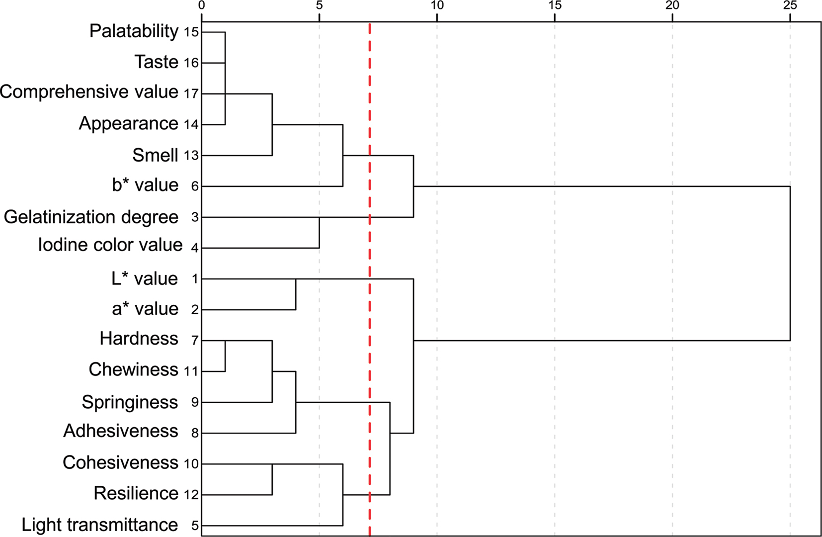 There were different similarities between the quality indexes of fresh instant rice. Cluster analysis can be used to classify the indexes; it separates the indexes with large differences and gathers similar indexes together to reduce the number of indexes. We used Ward’s clustering method to screen the quality indexes of fresh instant rice. The basic idea of Ward’s method is to treat each index as one class first, and a total of n indexes are divided into n classes; the distance between every two indexes is calculated, and the two classes with the nearest distance are merged into one class; then the distances between the current n–1 indexes are calculated, and the two classes with the nearest distance are merged; this process is repeated until all the indexes are combined into one class.