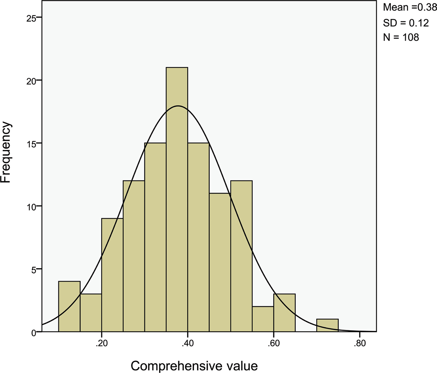 As shown in Table 10, the mean of comprehensive evaluation values of 108 fresh instant rice varieties was 0.378, and variable coefficient was 31.788%. The distribution graph showed that the comprehensive values were mainly distributed between 0.3 and 0.5, including 26 varieties between 0.4 and 0.5 and 36 varieties between 0.3 and 0.4 (Fig. 2). Besides, the number of varieties with comprehensive values ≥0.7, 0.6≤ Y <0.7, 0.5 ≤ Y <0.6, 0.2≤ Y <0.3, and 0.1≤ Y <0.2 was 1, 3, 14, 21, and 7, respectively.