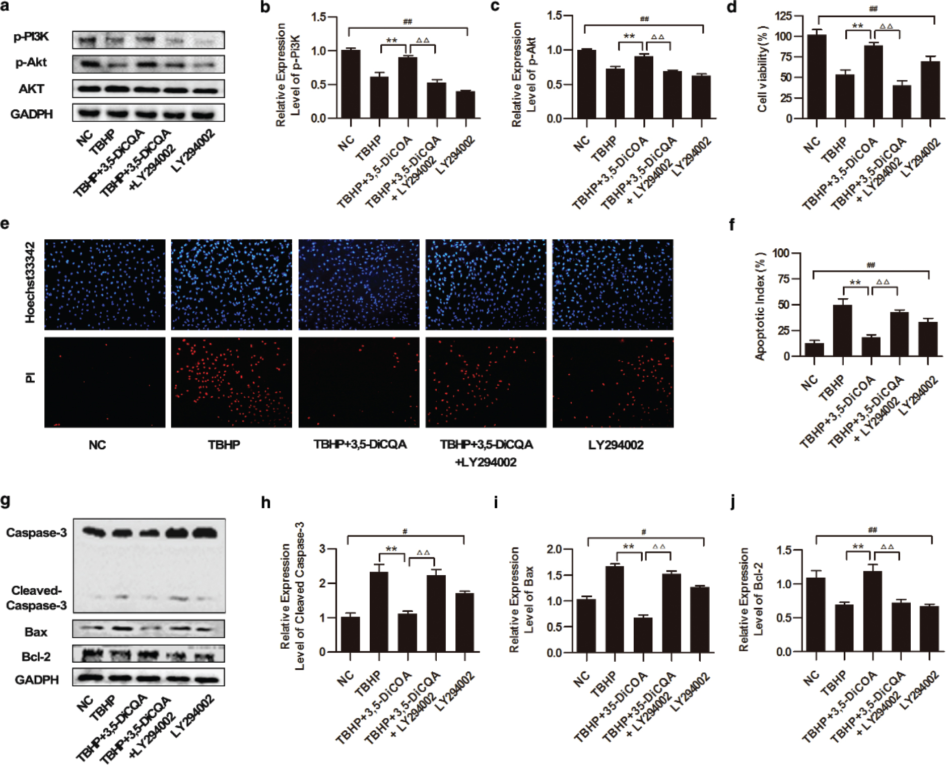 Fig. 3. Effects of 3,5-diCQA on TBHP-induced injury of H9C2 cells under inhibition of the PI3K/Akt signaling pathway. LY294002 was applied to inhibit the activation of the PI3K/Akt signaling pathway in this section. H9C2 cells were pre-incubated with 25 μM LY294002 for 1 h, and 20 μM 3,5-diCQA for another 24 h and then 75 μM TBHP. (a) Western blotting of the PI3K/Akt signaling and the fold activation data analysis (b and c) (n = 3); (d) cell viability of H9C2 determined by MTT assay (n = 6); (e and f) Percentage of apoptotic cells of H9C2 determined by Hoechst 33342/PI staining (n = 3); (g) Western blotting of apoptosis-related proteins including cleaved caspase-3, Bax and Bcl-2 and the fold activation data analysis (h through j) (n = 3). Data were shown as mean ± SD. #p < 0.05, ##p < 0.01 vs. normal control (NC); *p < 0.05, **p < 0.01 vs. TBHP group; Δp < 0.05, ΔΔp < 0.01 vs. 3,5-DiCQA + TBHP group.