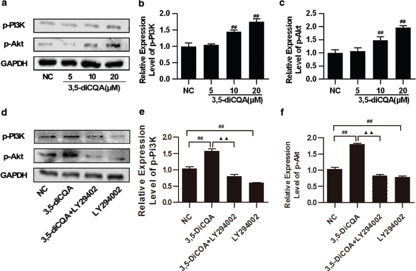 Fig. 4. Effects of 3,5-diCQA on the expression of activated PI3K/Akt signaling mediators in H9C2 cells. H9C2 cells were incubated with 3,5-diCQA (5, 10, and 20 μM) for 24 h. LY294002 was used in inhibitory experiments and H9C2 cells were pre-incubated with 25 μM LY294002 for 1 h, and 20 μM 3,5-diCQA for another 24 h. The indicated proteins were detected by Western blot. (a) Representative images of p-PI3K and p-Akt expression and their quantification (b and c); (d) expression of p-PI3K and p-Akt in presence of LY294002 and their quantification (e and f). The results were expressed as means ± SD (n = 3). #p < 0.05, ##p < 0.01 vs. normal control (NC); ▲p < 0.05, ▲▲p < 0.01 vs. 3,5-DiCQA group.