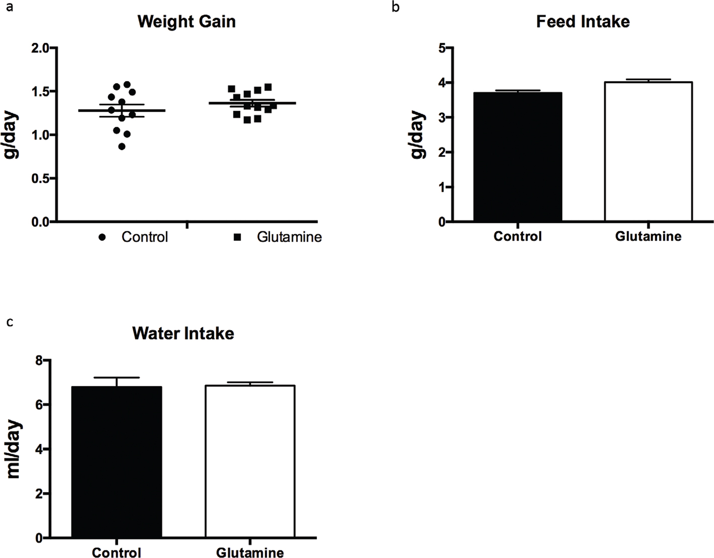 Fig. 1. The weight gain in weanling mice. The weight gain (a), food intake (b), and water intake (c) were monitored during the experiment. Weight gain data were analyzed by unpaired t-test, while the data about food intake and water intake were analyzed by Mann–Whitney test. The data are Mean ± SD with an n = 11 in control group and 12 in glutamine group.