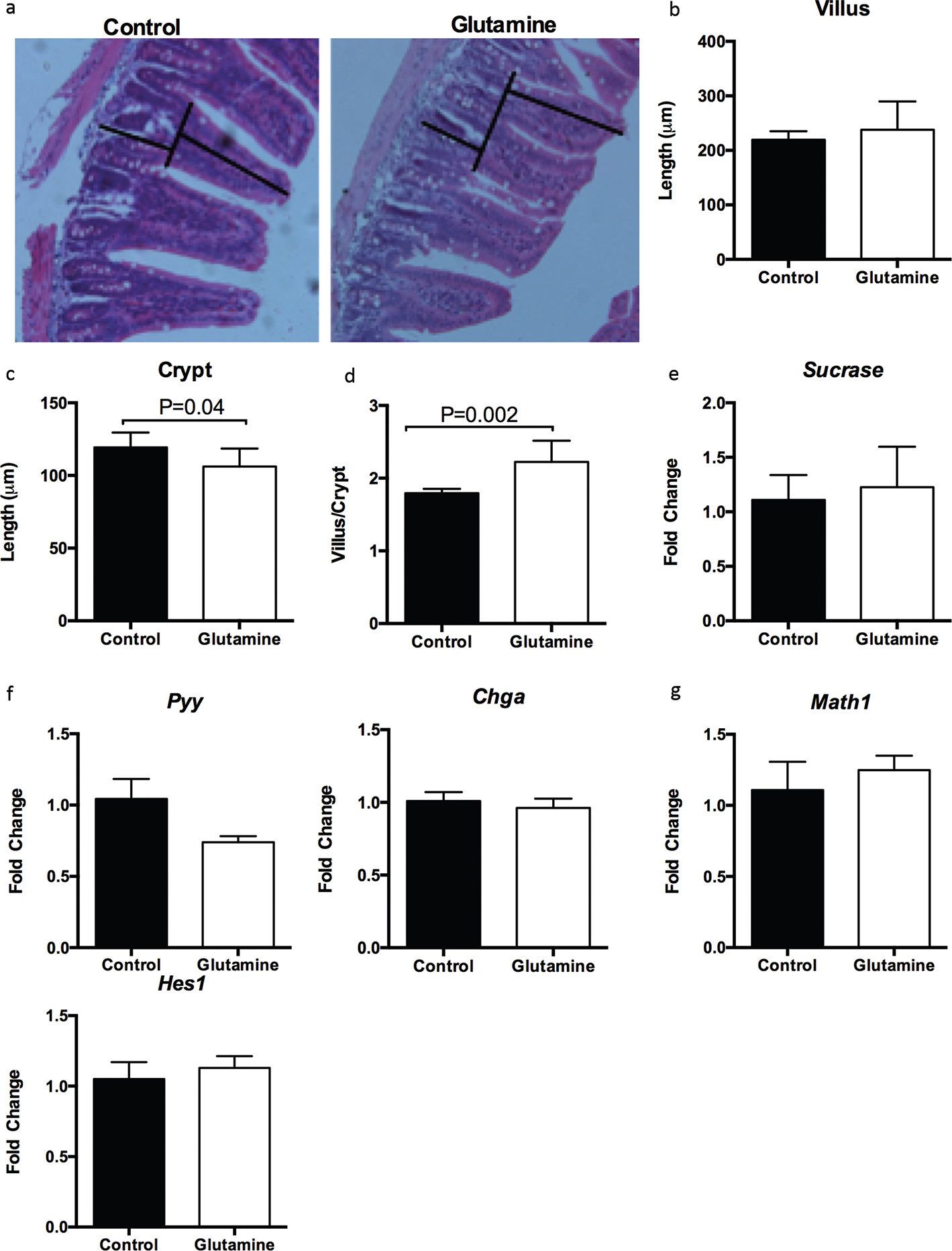Fig. 2. Glutamine improves the ratio of villus to crypt in the ileum of weanling mice. (a) Representative images of hematoxylin and eosin (H&E) staining in the ileum of weanling mice were shown (×200; n = 8). The villus length and crypt depth were measured as indicated in the image. (b–d) The statistical analysis of villus length (b), crypt depth (c), and the ratio of villus to crypt (d) from images shown at (a). The data related to villus length and crypt depth were analyzed by unpaired t-test, while the data related to the ratio of villus to crypt were analyzed by Mann–Whitney test. The data are Mean ± SD with an n = 8. (e–g) mRNA expressions of sucrase (e), enteroendocrine cells-expressed chromogranin A (CHGA) and peptide YY (PYY) (f), as well as Hes1 and Math1 (g) were analyzed in the ileum. N = 10, data were analyzed with unpaired t-test. The data are Mean±SEM.