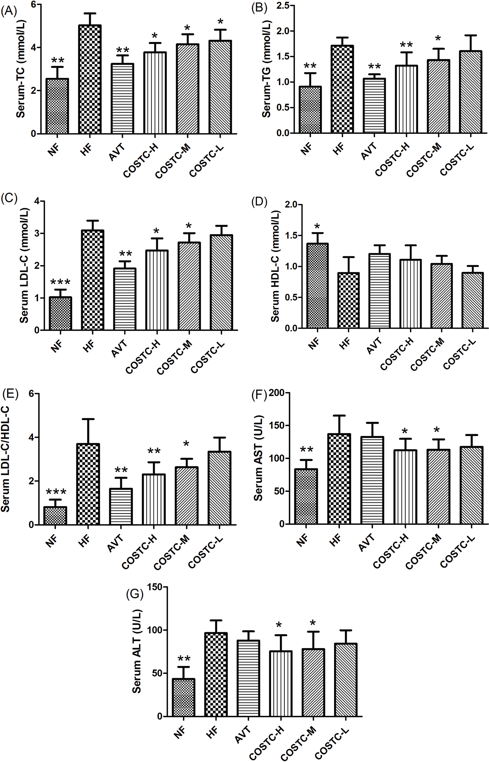 Fig. 4. The serum and liver lipid levels in high-fat diet rats. The effect of COSTC on lipid levels in the serum (a-d), AI in the serum (e), and AST activity and ALT activity in the serum (f-g) after 6 weeks of treatment. The data are presented as the means ± SD (n = 10). Note: Compared with HF, * p < 0.05; ** p < 0.01.