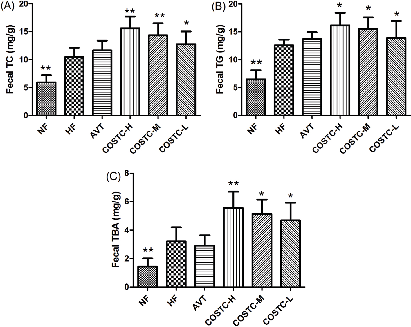 Fig. 5. The fecal levels TC, TG, and TBA fetal in high-fat diet rats. The effect of COSTC on fecal levels of TC (a), TG (b), and TBA (c) after 6 weeks of treatment. The data are presented as the means ± SD (n = 10). Note: Compared with HF, * p < 0.05; ** p < 0.01.