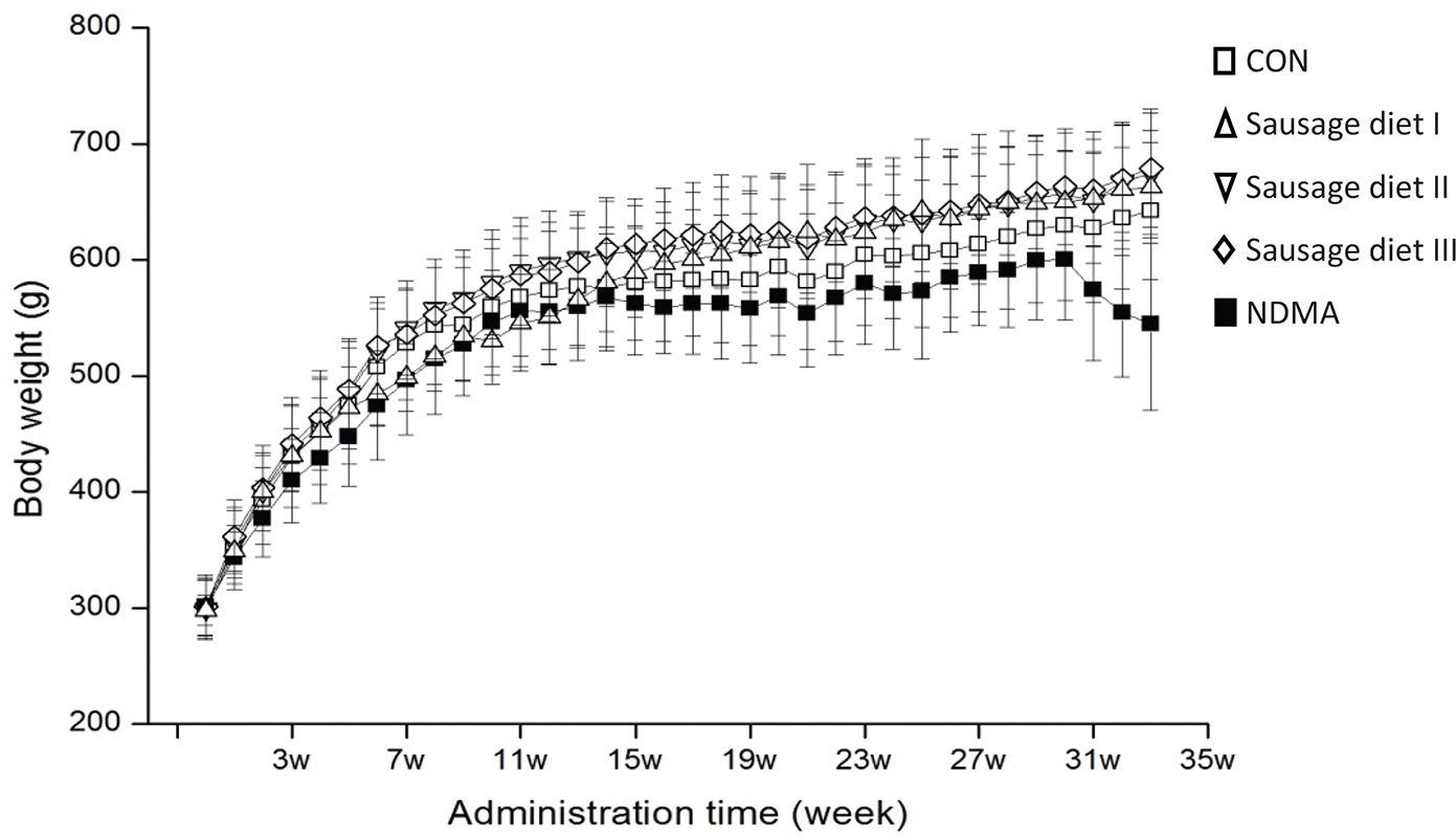 Fig. 1. Body weights of rats were measured during the experiment. It’s expressed as mean ± S.D. Open square: fed with AIN-93G diet (CON group); regular triangle: fed a granular diet of 1 part Chinese sausage (NDMA content in sausage not exceeding the tolerated limit) to 5.5 parts certified rat chow (sausage diet I); inverted triangle: fed a granular diet of 1 part Chinese sausage (excessive NDMA content in sausage) to 5.5 certified rat chow (sausage diet II); rhombus: fed a granular diet of 1 part Chinese sausage (excessive NDMA content in sausage) to 2.7 parts certified rat chow (sausage diet III); filled square: fed with AIN-93G diet and 30 μg/kg NDMA in drinking water (NDMA group). NDMA, N-nitrosodimethylamine; CON, control.