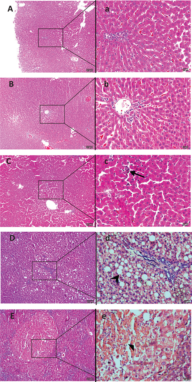 Fig. 2. Representative photomicrographs of H&E-stained formalin fixed liver sections from each group rats. During the 33 weeks of feeding, normal liver histology was shown in the control group (A, ×100; a, ×400). A slight hepatic sinusoid was found in sausage diet group I after 25 weeks of feeding (B, ×100; b, 400). In the meantime, a moderate hepatic sinusoidal dilatation, infiltration of a large amount of inflammatory cells (arrow) in hepatic lobules were observed in sausage diet group II (C, ×100; c, ×400). Moreover, fatty degeneration (arrow), fibroblastic proliferation in the portal area, and hepatic lobules were present in sausage diet group III (D, ×100; d, ×400). For the NDMA group, the hepatocyte necrosis (solid triangle), as indicated by the swollen and pale-staining hepatocytes with dilated endoplasmic reticulum, occurred after 25 weeks (E, ×100; e, ×400). NDMA, N-nitrosodimethylamine; H&E, hematoxylin–eosin.
