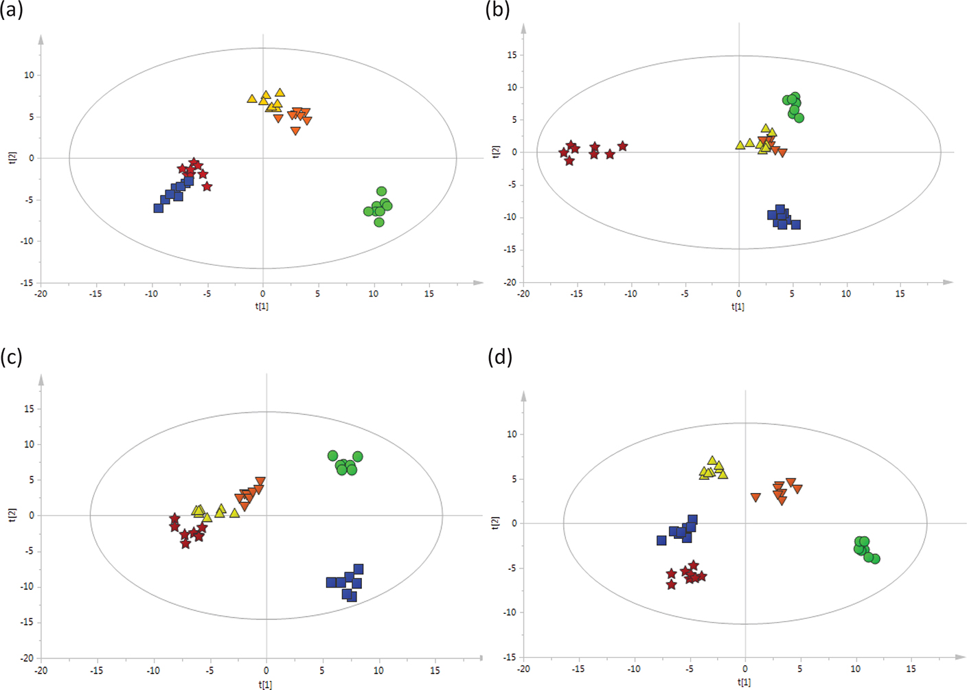 Fig. 3. OPLS-DA score plots (a through d) based on the GC-MS data of rat serum treated with sausage and NDMA at different treatment times: (a) rats treated for 7 weeks; (b) rats treated for 17 weeks; (c) rats treated for 25 weeks; (d) rats treated for 33 weeks; n = 8 per group. Green filled circles: given the AIN-93G diet (CON group); blue filled squares: fed a granular diet of 1 part Chinese sausage (NDMA content in sausage not exceeding the tolerated limit) to 5.5 parts certified rat chow (sausage diet I); orange filled inverted triangles: fed a granular diet of 1 part Chinese sausage (excessive NDMA content in sausage) to 5.5 parts certified rat chow (sausage diet II ); yellow filled triangles: fed a granular diet of 1 part Chinese sausage (excessive NDMA content in sausage) to 2.7 parts certified rat chow (sausage diet III); red filled pentacles: fed with the AIN-93 diet and 30 μg/kg NDMA in the drinking water group (NDMA group). NDMA, N-nitrosodimethylamine; OPLS-DA, orthogonal partial least squares–discriminant analysis; GC-MS, gas chromatography–mass spectrometry.