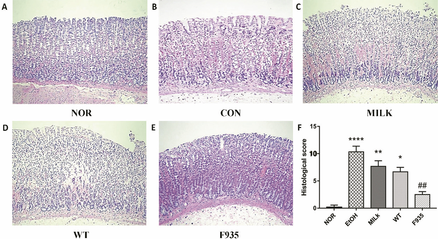 Fig. 2. Histopathological analysis of gastric mucosa (hematoxylin and eosin staining, ×100). (A) NOR group; (B) EtOH group; (C) MILK group; (D) WT group; (E) F935 group; (F) histological score. ****p < 0.0001, **p < 0.01, and *p < 0.05 vs. the NOR group, ##p < 0.05 vs. the EtOH group.