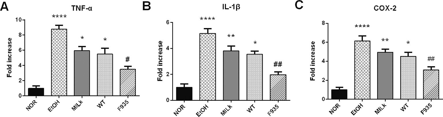 As shown in Fig. 5, the EtOH group showed higher expression of TNF-α, IL-1β, and COX-2 mRNA (8.79, 5.15, and 6.13 times the NOR group values, respectively). Expression of these genes in the MILK and WT groups decreased, but there were no significant differences compared to the EtOH group (p > 0.05). However, L. reuteri F-9-35 pretreatment significantly suppressed the overexpression of these genes induced by ethanol.