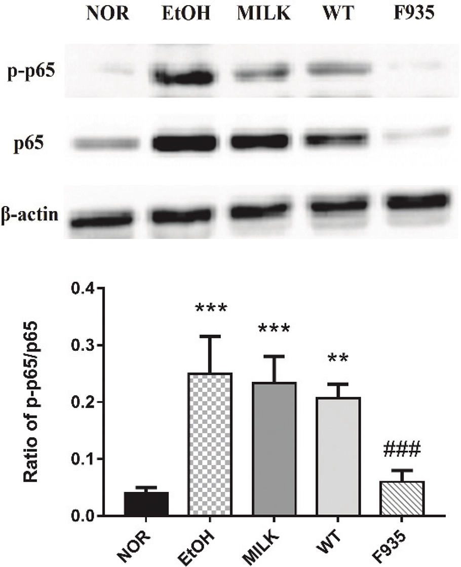 The ratio of p-p65 to p65 can be used to reflect the activity of the NF-κB pathway (10). As shown in Fig. 6, ethanol treatment significantly increased NF-κB activity in the EtOH, MILK, and WT groups compared to the NOR group (p < 0.001, p < 0.001, and p < 0.01, respectively). However, the NF-κB activity of gastric tissues from F935 rats was significantly downregulated compared to the EtOH group (p < 0.001).