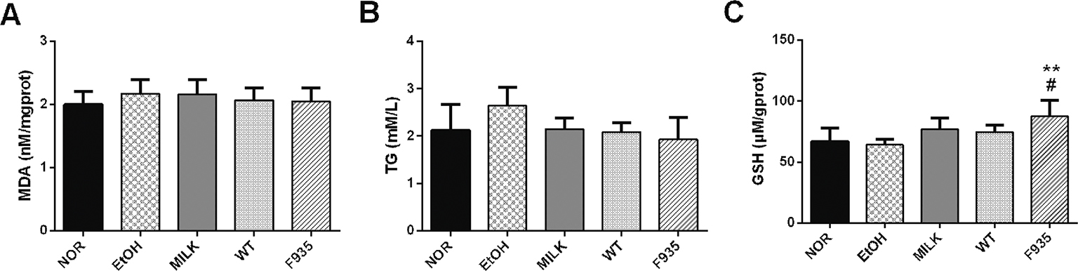 The MDA and TG levels in the liver had no significant difference among all groups (Fig. 6A and B, p > 0.05). Of note, the GSH level in the F935 group was significantly higher than that of the NOR or EtOH groups (Fig. 6C; p < 0.01 and p < 0.05, respectively).