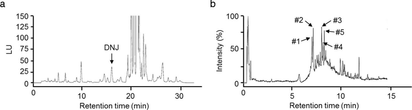 Fig. 1. Representative chromatograms of MLE. (a) HPLC analysis of DNJ in MLE. (b) LC-MS analysis of phenolic compounds in MLE. Numbers refer to the main peaks identified: #1, 4-O-caffeoylquinic acid; #2, 1-O-caffeoylquinic acid; #3, kaempferol-3,7-diglucoside; #4, 6-hydroxykaempferol-3-O-glucoside; #5, genistein-7,4’-di-O-β-D-glucoside.