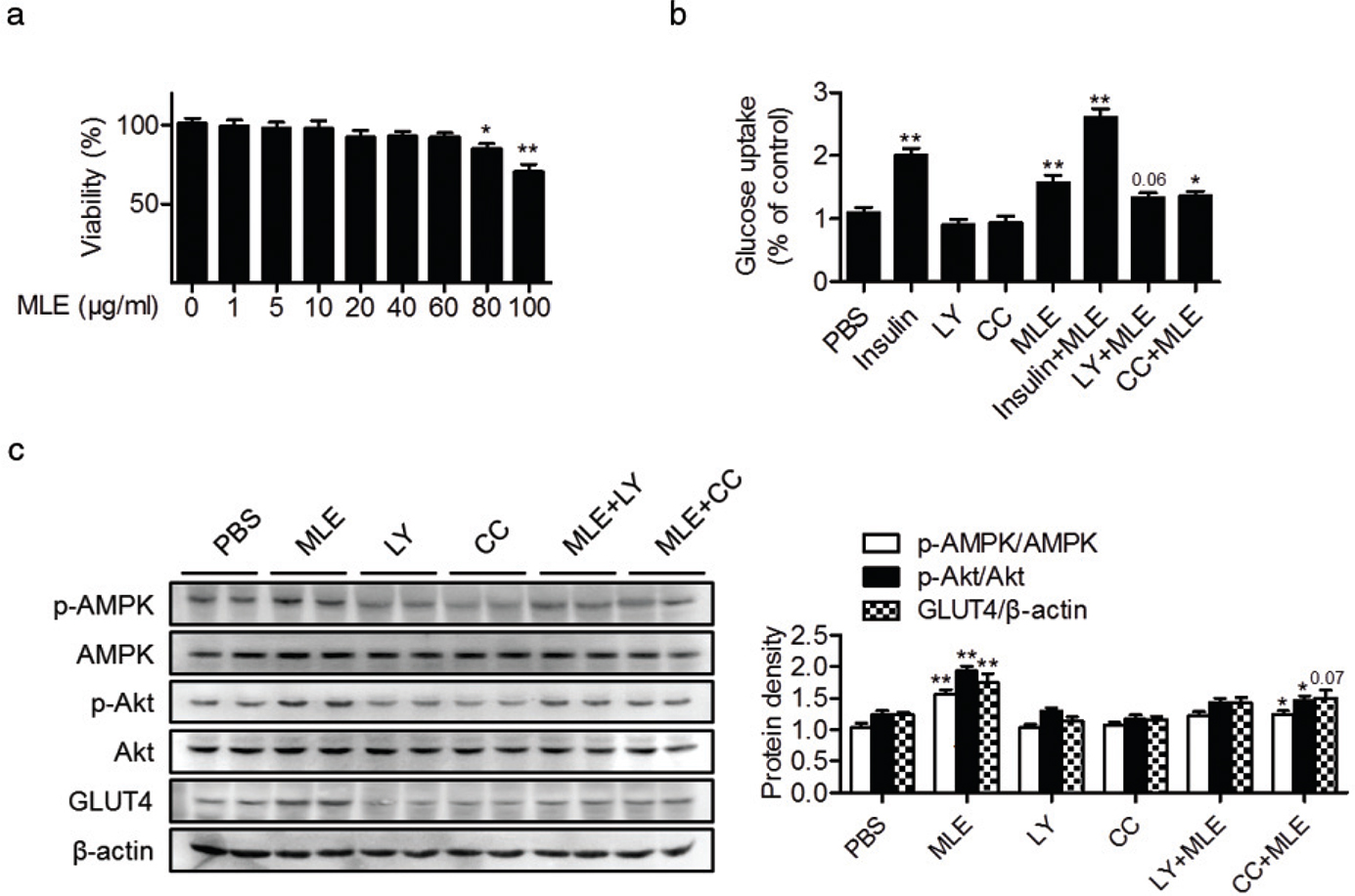 To investigate whether MLE has direct effects on muscle cell glucose uptake, L6 myotubes were treated with various concentrations of MLE. The cell viability observed after treatment with ≤60 μg/mL of MLE was similar to that of the control (Fig. 2a). MLE (60 μg/mL) treatment increased [3H]-2-deoxy-D-glucose uptake into myotubes (Fig. 2b). Interestingly, glucose uptake was not dependent on the insulin action. To elucidate the mechanism behind this increase in glucose uptake, the levels of p-Akt, p-AMPK, and GLUT4 were measured by western blotting. A significant increase of p-Akt/Akt, p-AMPK/AMPK, and GLUT4 was observed after MLE treatment (Fig. 2c). Using the PI3-K inhibitor LY294002 and the AMPK inhibitor compound C, we further confirmed the activation of the PI3K/Akt and AMPK pathways in the MLE-stimulated glucose uptake (Figs. 2b and 2c).