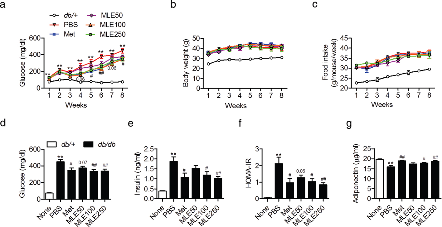 Design: Male db/db mice were treated with either MLE (50 mg/kg, 100 mg/kg, and 250 mg/kg) or metformin (100 mg/kg) for 8 weeks.