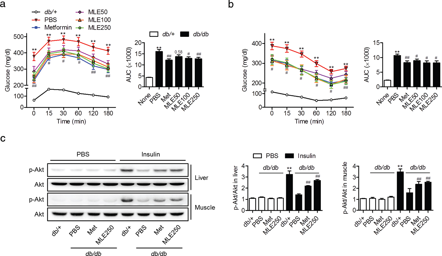 Fig. 4. Effects of MLE supplementation on insulin sensitivity in db/db mice. At the 7th week, glucose concentrations during oral glucose tolerance tests (a) and insulin tolerance tests (b) were measured. Areas under the curve were compared (n = 7/each group). (c) At the end of the study, insulin-stimulated Akt phosphorylation was measured in the liver and skeletal muscle. The band intensities of p-Akt and Akt were quantitated (n = 3/each group). Values are expressed as mean±SEM. **p < 0.01 versus db/+ or db/+ with PBS, #p < 0.05 and ##p < 0.01 versus db/db+PBS or db/+ with insulin.