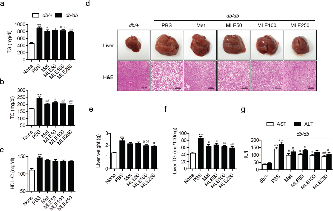 Fig. 5. Effects of MLE supplementation on hepatic steatosis and serum lipid profiles in db/db mice. (a–c) At the end of the study, serum levels of triglyceride (TG), total cholesterol (TC), and high-density lipoprotein cholesterol (HDL-C) were analyzed. (d) Macroscopic and microscopic images of liver sections. Liver sections were stained with H&E. Bar = 100 μm. (e, f) Liver wet weight and hepatic TG content were determined. (g) Serum levels of AST and ALT were measured as an index of liver injury. Values are expressed as mean±SEM (n = 7/each group). **p < 0.01 versus db/+, #p < 0.05 and ##p < 0.01 versus db/db+PBS.